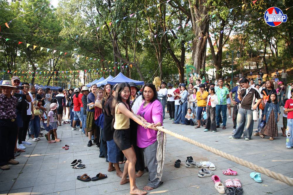 People Enjoy Leak Kanseng Folk Game at Wat Phnom on Last Day of Khmer New Year Festival
