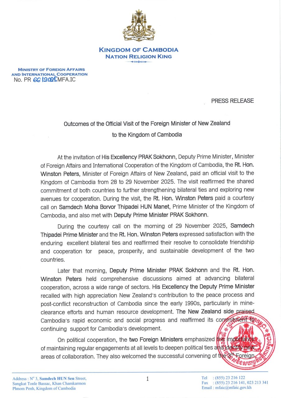 Outcomes of Official Visit of Foreign Minister of New Zealand to Cambodia