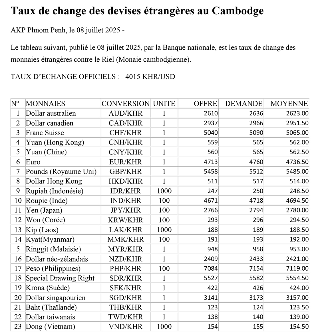 AKP Phnom Penh, le 08 juillet 2025 - Le tableau suivant, publié le 08 juillet 2025, par la Banque nationale, est les taux de change des monnaies étrangères contre le Riel (Monaie cambodgienne).