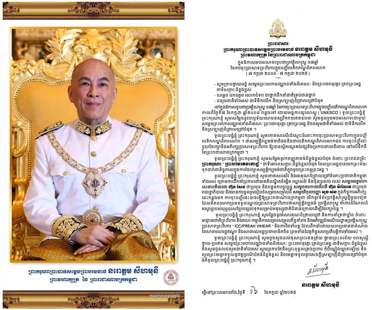 AKP Phnom Penh, le 07 juillet 2025 -- Sa Majesté Preah Bat Samdech Preah Boromneath Norodom Sihamoni, Roi du Cambodge, a exprimé ses félicitations au 17e anniversaire de l’inscription du Temple de Preah Vihear sur la Liste du patrimoine mondial, le 7 juillet 2008, par l’UNESCO. « Je tiens à exprimer ma sincère gr...