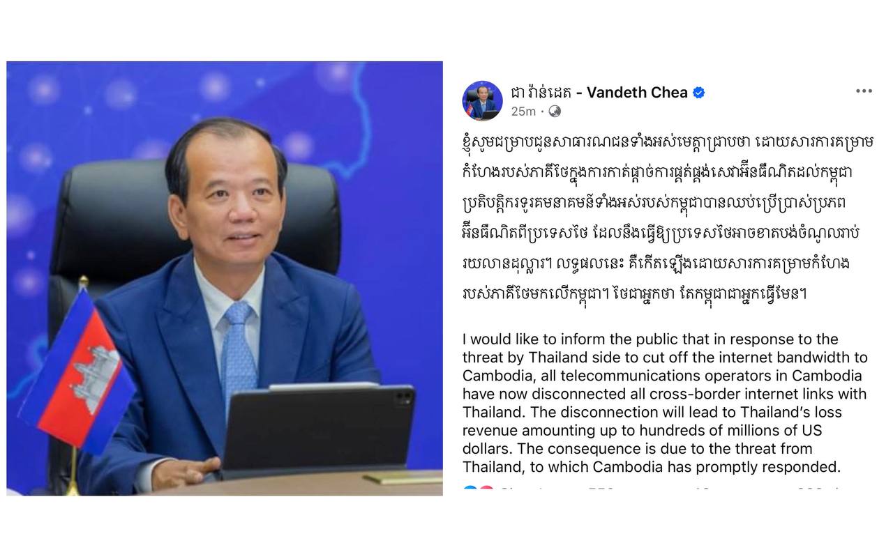AKP Phnom Penh, le 13 juin 2025 -- En réponse à la menace thaïlandaise de couper la bande passante internet vers le Cambodge, tous les opérateurs de télécommunications cambodgiens ont interrompu toutes leurs liaisons internet transfrontalières avec la Thaïlande. L’annonce a été faite hier soir par Chea Vandeth, m...