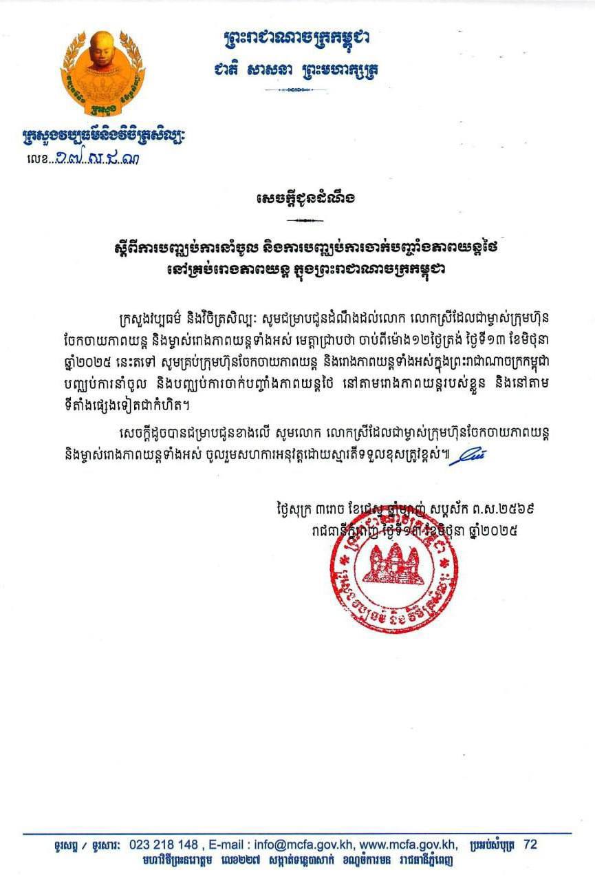 AKP Phnom Penh, le 13 juin 2025 -- Le ministère de l'Information a ordonné à toutes les chaînes de télévision locales de cesser la diffusion de films thaïlandais à compter du 12 juin 2025 à minuit. « Le ministère de l'Information souhaite informer les propriétaires de toutes les chaînes de télévision qu'à co...
