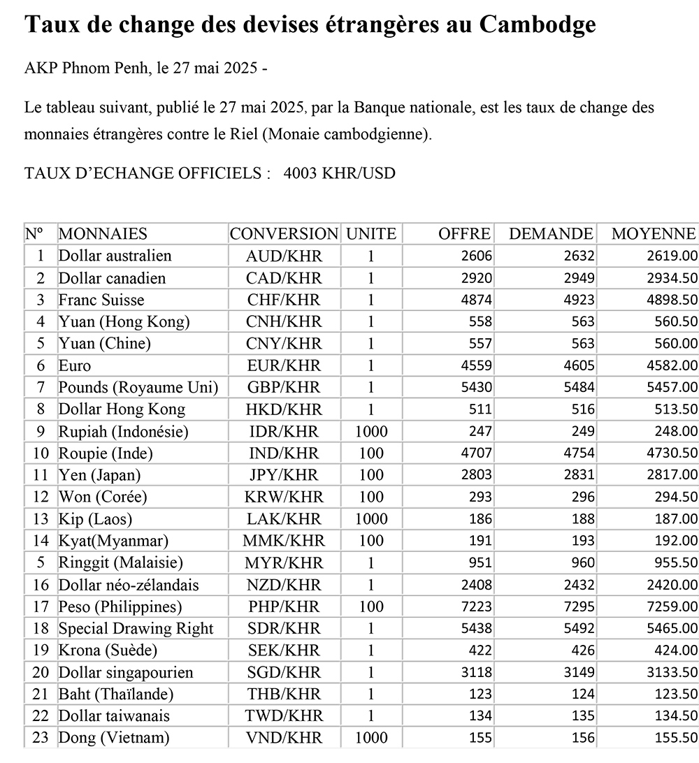 AKP Phnom Penh, le 27 mai 2025 - Le tableau suivant, publié le 27 mai 2025, par la Banque nationale, est les taux de change des monnaies étrangères contre le Riel (Monaie cambodgienne).