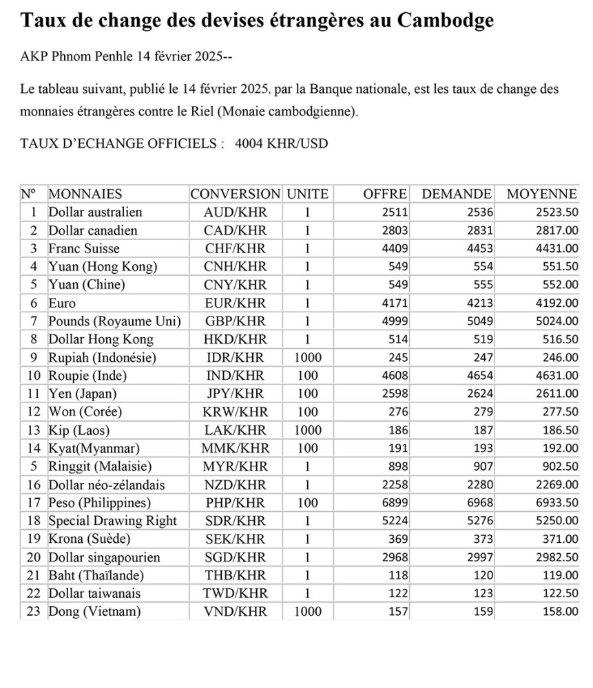 Le tableau suivant, publié , le 14 février 2025, par la Banque nationale, est les taux de change des monnaies étrangères contre le Riel (Monaie cambodgienne).