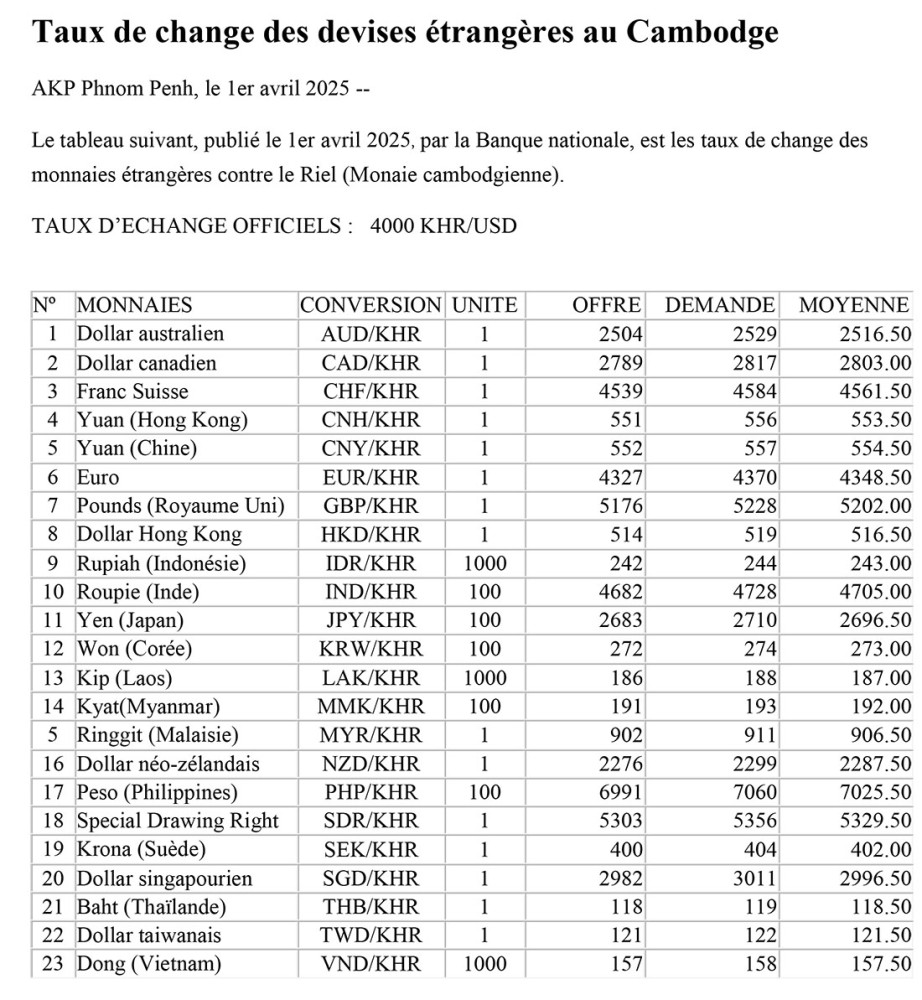 Le tableau suivant, publié le 1er avril 2025, par la Banque nationale, est les taux de change des monnaies étrangères contre le Riel (Monaie cambodgienne).