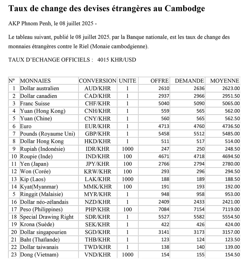 Le tableau suivant, publié le 08 juillet 2025, par la Banque nationale, est les taux de change des monnaies étrangères contre le Riel (Monaie cambodgienne).