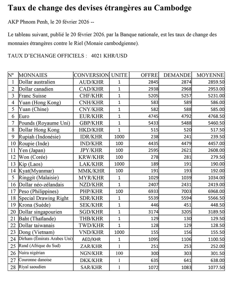 Le tableau suivant, publié le 20 février 2026, par la Banque nationale, est les taux de change des monnaies étrangères contre le Riel (Monaie cambodgienne).