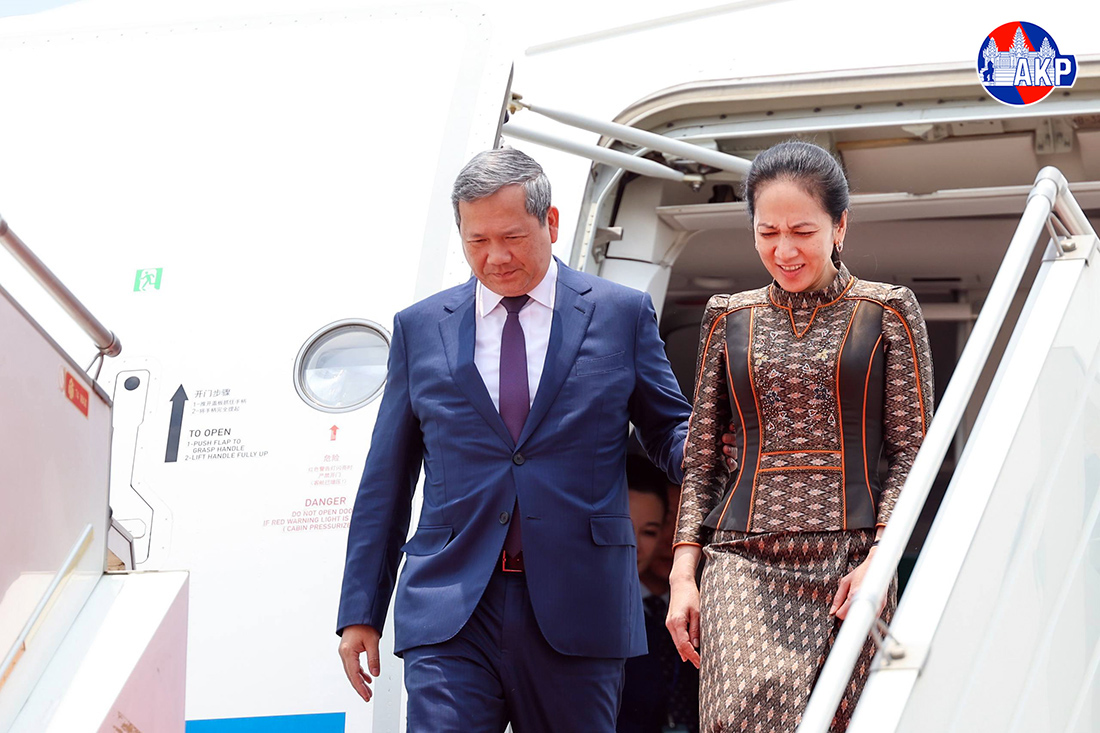 Le Premier ministre Samdech Moha Borvor Thipadei Hun Manet (gauche, photo 1) et la Première dame, Lok Chumteav Dr. Pich Chanmony, descendent d'un avion spécial à leur arrivée ce matin à l'aéroport international de Techo, après avoir participé au Sommet One Health (Une seule santé) et effectué une visite de travail en France depuis le 6 avril.