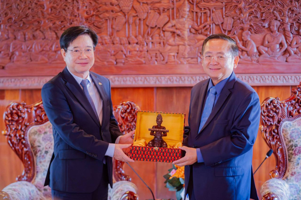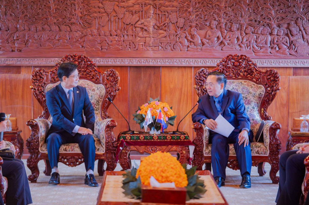 Sok Lou (droite, photo 1), gouverneur de la province de Battambang, s'entretient avec Kim Chang Yong, ambassadeur de la République de Corée au Cambodge, à l'hôtel de ville de Battambang, le 29 avril.