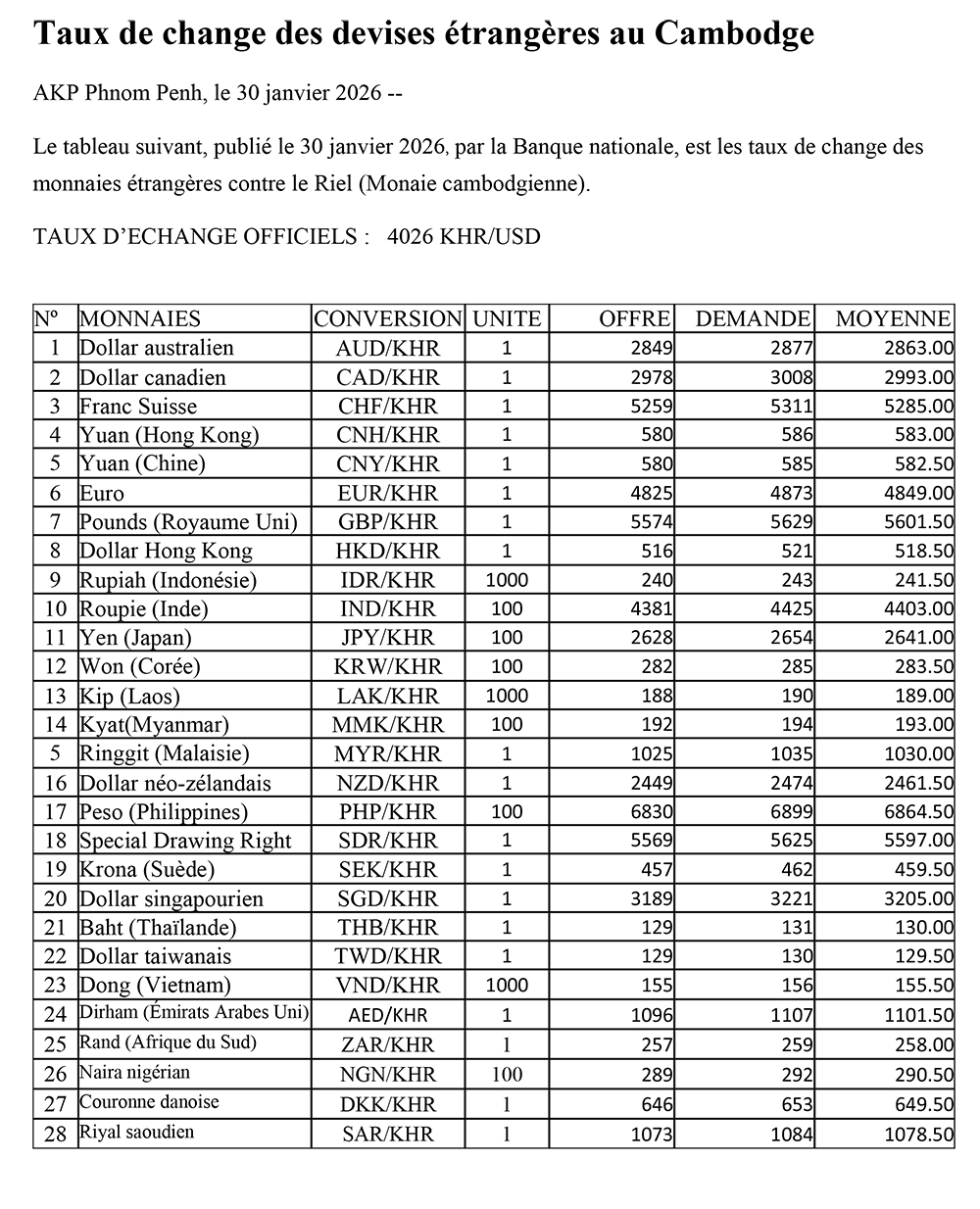 Taux de change des devises étrangères au Cambodge
