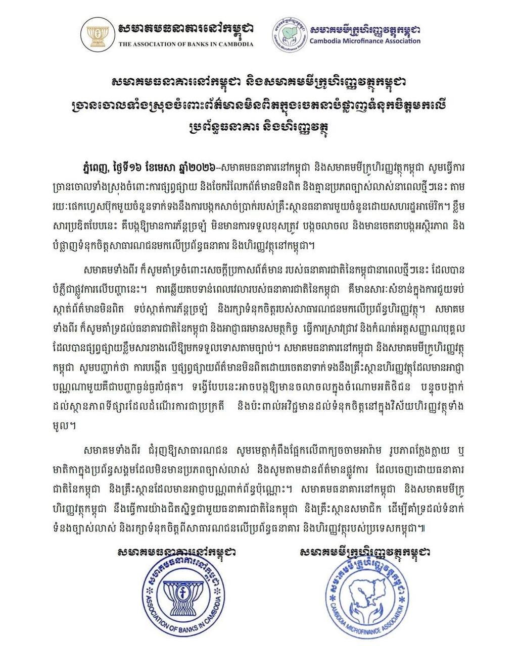 សមាគមធនាគារនៅកម្ពុជា និងសមាគមមីក្រូហិរញ្ញវត្ថុកម្ពុជា ច្រានចោលទាំងស្រុងចំពោះព័ត៌មានមិនពិតក្នុងចេតនាបំផ្លាញទំនុកចិត្តមកលើ ប្រព័ន្ធធនាគារ និងហិរញ្ញវត្ថុ