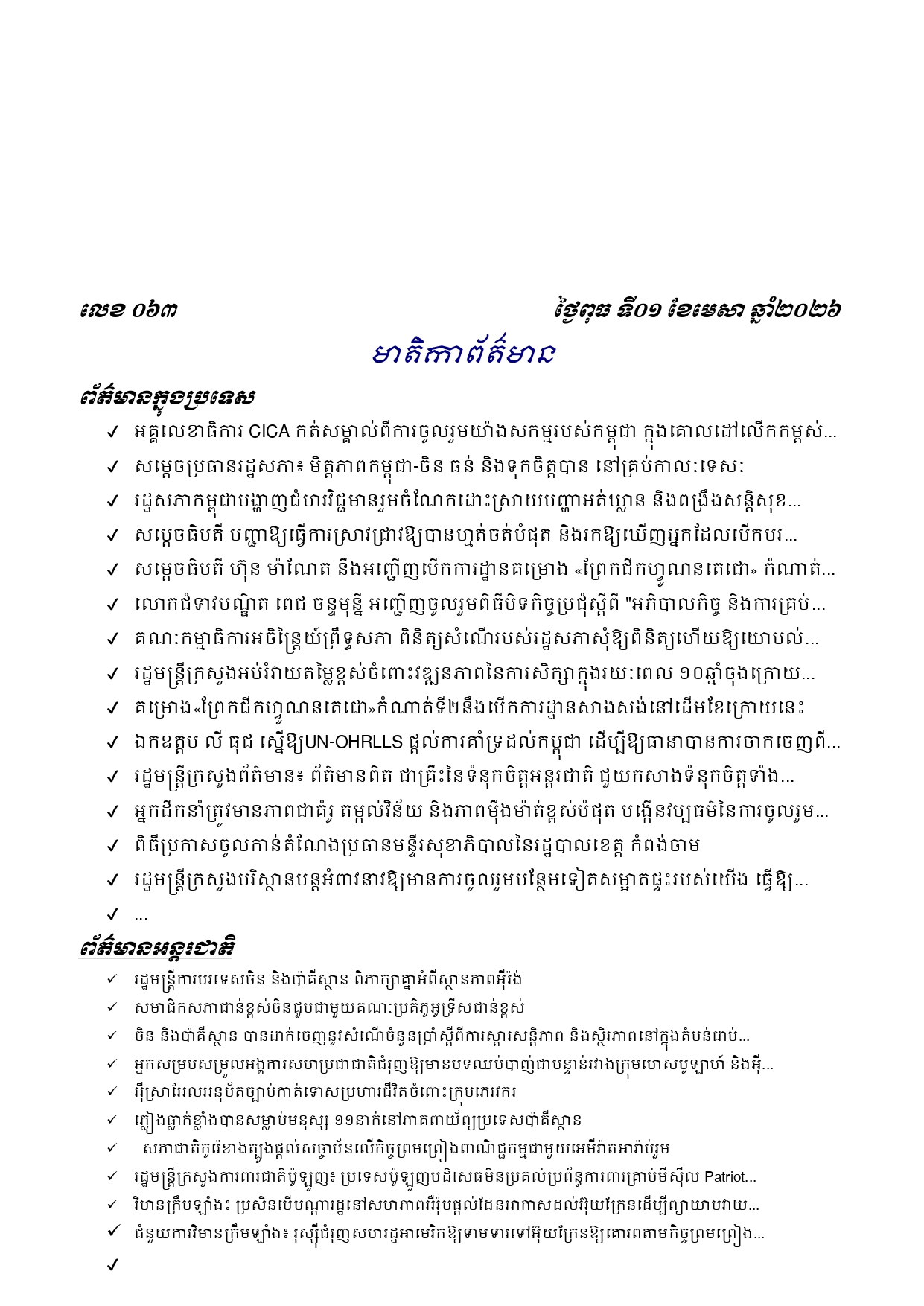 ព្រឹត្តិប័ត្រព័ត៌មានចេញផ្សាយសម្រាប់ថ្ងៃពុធ ទី០១ ខែមេសា ឆ្នាំ២០២៦