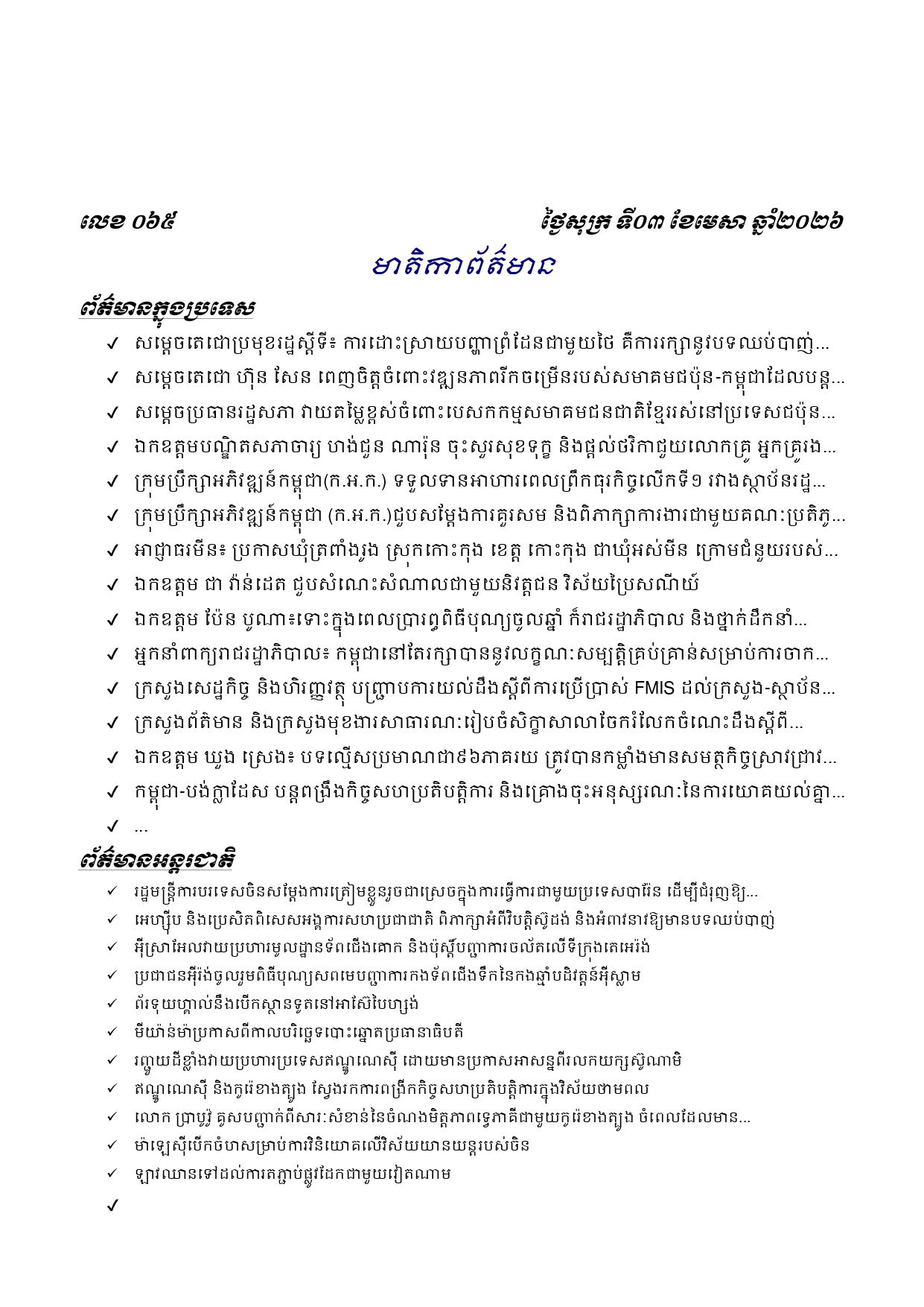 ព្រឹត្តិប័ត្រព័ត៌មានចេញផ្សាយសម្រាប់ថ្ងៃសុក្រ ទី០៣ ខែមេសា ឆ្នាំ២០២៦