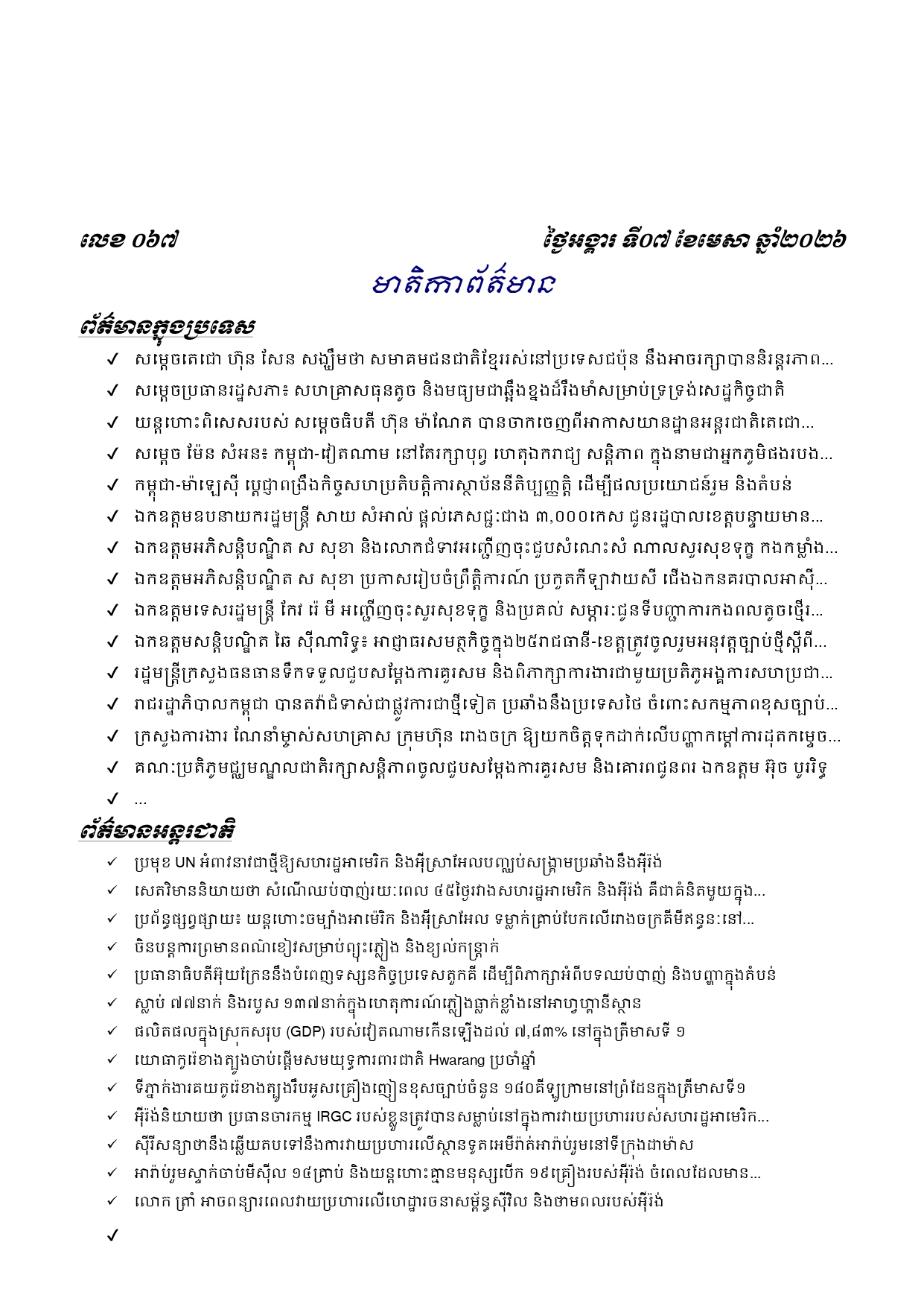 ព្រឹត្តិប័ត្រព័ត៌មានចេញផ្សាយសម្រាប់ថ្ងៃអង្គារ ទី០៧ ខែមេសា ឆ្នាំ២០២៦