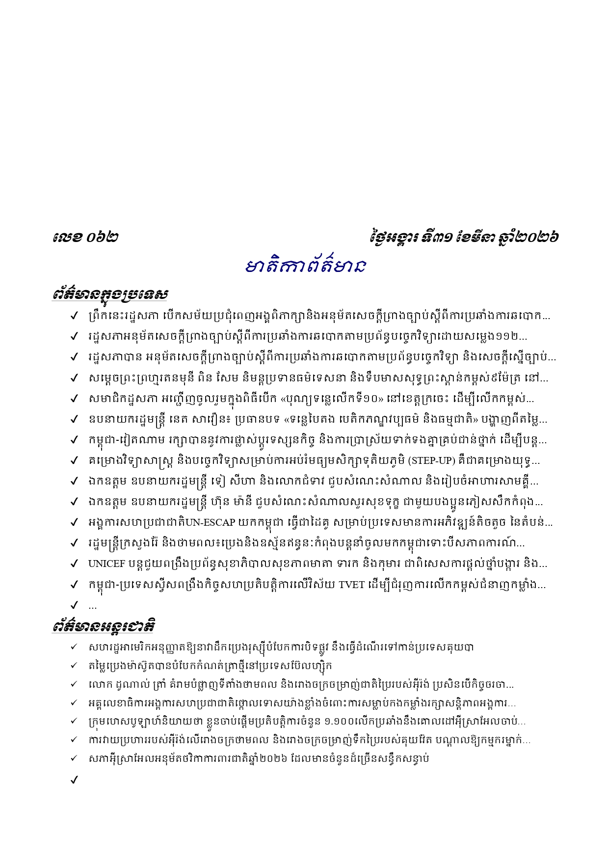ព្រឹត្តិប័ត្រព័ត៌មានចេញផ្សាយសម្រាប់ថ្ងៃអង្គារ ទី៣១ ខែមីនា ឆ្នាំ២០២៦