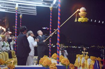 ព្រះករុណា ព្រះមហាក្សត្រ ប្រទានភ្លើងទៀនជ័យ ចាប់ផ្តើមការដង្ហែប្រទីប និងបាញ់កាំជ្រួច នាថ្ងៃដំបូង នៃព្រះរាជពិធីបុណ្យអុំទូក