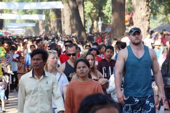 AKP សៀមរាប ថ្ងៃទី២១ ខែវិច្ឆិកា ឆ្នាំ២០១៨ -- ភ្ញៀវជាតិ និងអន្តរជាតិ ព្រមទាំងប្រជាពលរដ្ឋរាប់ម៉ឺននាក់ ចូលរួមទស្សនាការប្រណាំងទូក និងដើរកំសាន្ត ក្នុងពិធីបុណ្យអុំទូក បណ្តែតប្រទីប និងសំពះព្រះខែ អកអំបុក នៅខេត្តសៀមរាប នាថ្ងៃទី២១ ខែវិច្ឆិកា ឆ្នាំ២០១៨។ រូបថត៖ ឃុត សៅ