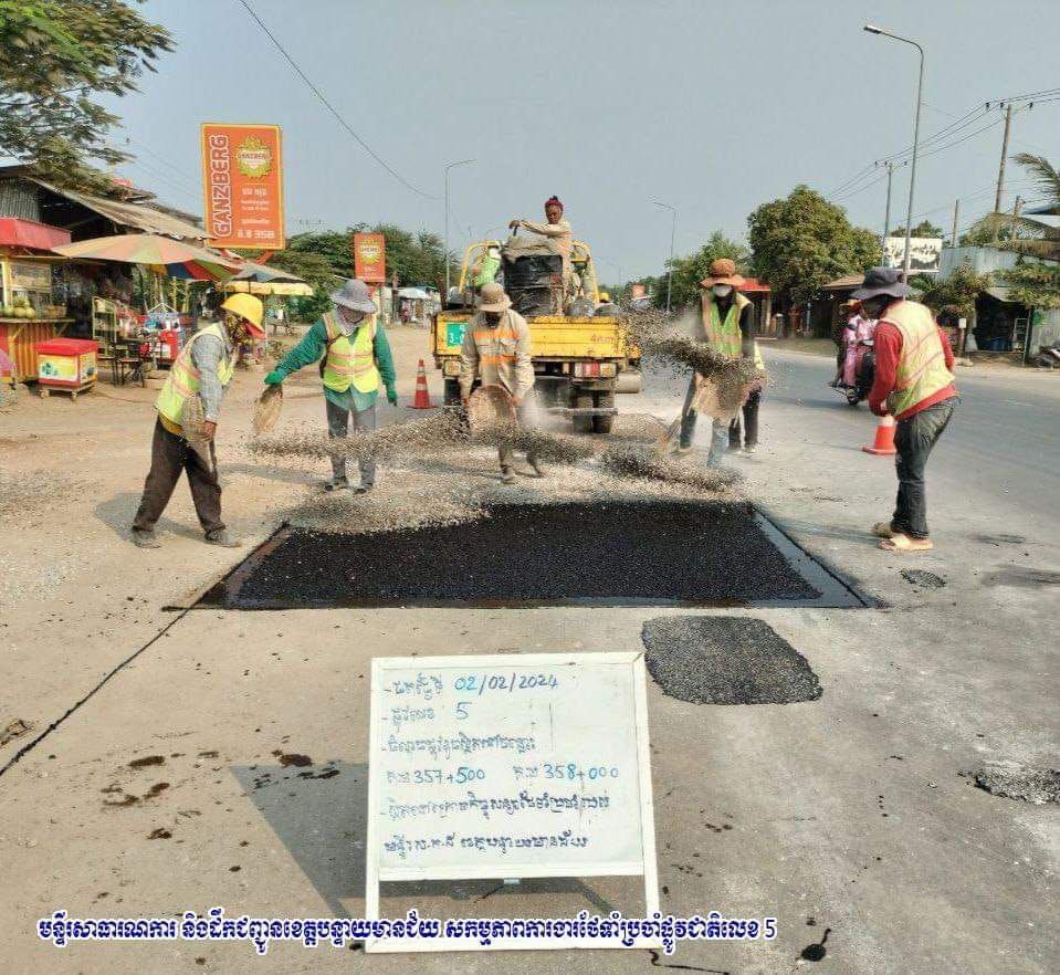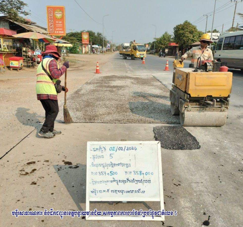 លោកបានឱ្យដឹងថា នៅដើមសប្តាហ៍ទី១ ខែកុម្ភៈ ឆ្នាំ២០២៤នេះក្រុមការងារជំនាញបាននិងកំពុងចុះជួសជុលផ្លូវជាតិលេខ៥ ចាប់ពីគីឡូម៉ែត្រ៣៥៧+៩០០ ដល់គីឡូម៉ែត្រ ៣៥៨+០០០ ដោយស្រោចកៅស៊ូបាចថ្មពីរជាន់ ។ បន្តការងារជួសជុលផ្លូវខេត្តលេខ១៥៦D ចាប់ពីគីឡូម៉ែត្រ ៨+៥០០ ដល់គីឡូម៉ែត្រ ១៦+០០០ ដោយជួសជុលចិញ្ចើមផ្លូវ និងស្រោចកៅស៊ូបាចថ្មលើស្នាមប្រេះ ស្ថិតនៅស្រុកមង្គលបូរី ។ បន្តការងារជួសជុលផ្លូវខេត្តលេខ២៥៨D ចាប់ពីគីឡូម៉ែត្រម ៥+៥០០ ដល់គីឡូម៉ែត្រ ៦+០០០ ដោយថែមដីល្បាយថ្ម រួចកៀរកិនបង្ហាប់ ស្ថិតនៅក្រុងប៉ោយប៉ែត ។ បន្តការងារជួសជុលផ្លូវជាតិលេខ៥៨ ដោយជួសជុលស្រទាប់គ្រឹះឡើងវិញស្ថិតនៅស្រុកថ្មពួក និងបន្តការងារជួសជុលផ្លូវខេត្តលេខ២៦៨A ដោយអ៊ុតគំនូសចរាចរណ៍ ស្ថិតនៅស្រុកស្វាយចេក ។