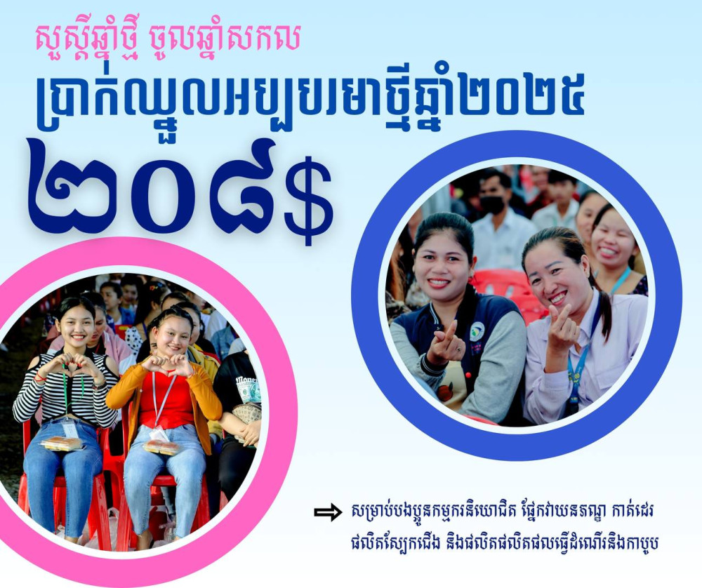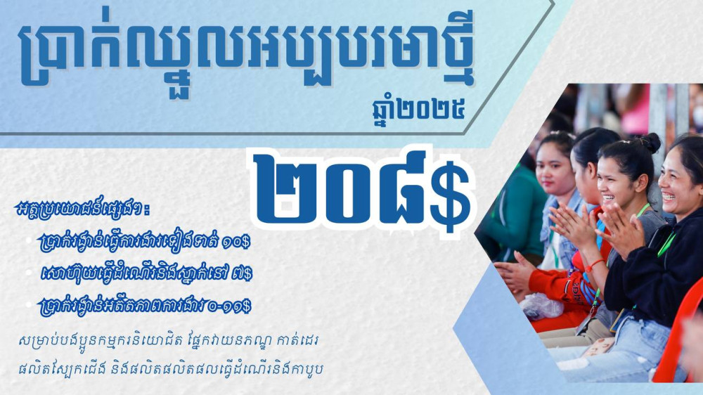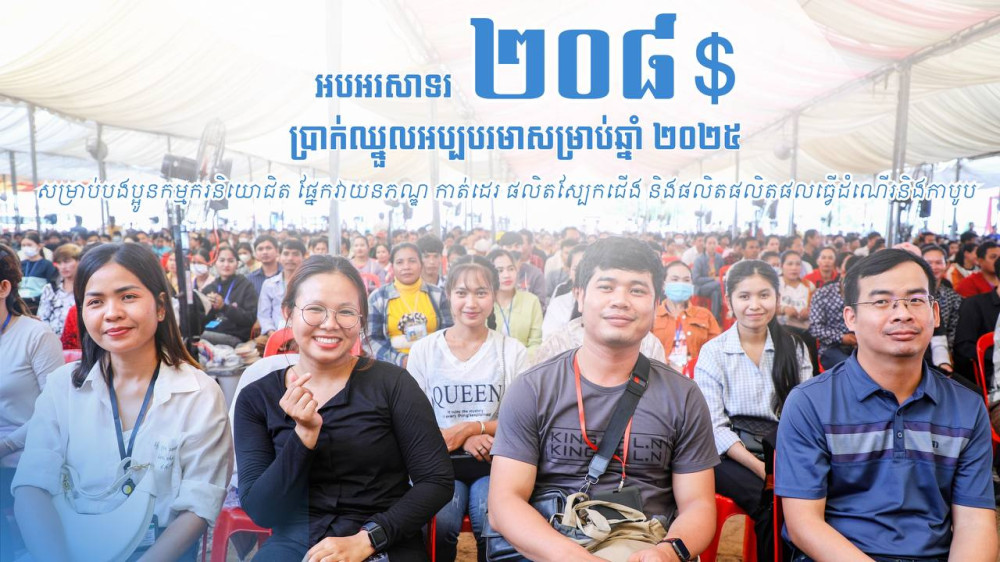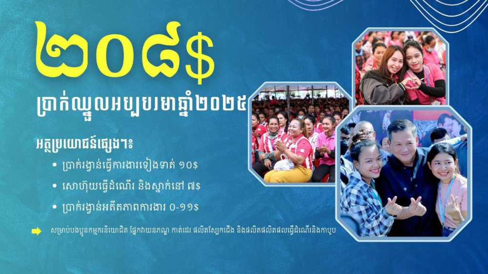 AKP ភ្នំពេញ ថ្ងៃទី០៣ ខែមករា ឆ្នាំ២០២៥–ការអនុវត្តប្រាក់ឈ្នួលអប្បបរមា ២០៨ដុល្លារ សម្រាប់កម្មករនិយោជិតនៃវិស័យវាយនភណ្ឌ កាត់ដេរ ផលិតស្បែកជើង និង ផលិតផលធ្វើដំណើរ និងកាបូប គឺបានអនុវត្តចាប់ពីខែមករា ឆ្នាំ២០២៥នេះហើយ ខណៈដែលកម្មករនិយោជិតសប្បាយចិត្ត និងអរគុណរាជរដ្ឋាភិបាល ហើយចាត់ទុកថាគោលនយោបាយដំឡើងប្រាក់ឈ្នួលជារៀងរាល់ឆ្នាំបង្ហាញយ៉ាងច្បាស់ពីការយកចិត្តទុកដាក់ចំពោះសុខទុក្ខរបស់កម្មករនិយោជិតពីសំណាក់រាជរដ្ឋាភិបាលកម្ពុជា។