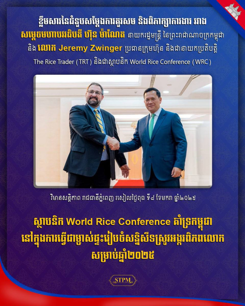 AKP ភ្នំពេញ ថ្ងៃទី០៨ ខែមករា ឆ្នាំ២០២៥–សម្ដេចមហាបវរធិបតី ហ៊ុន ម៉ាណែត នាយករដ្ឋមន្ត្រីនៃព្រះរាជាណាចក្រកម្ពុជា នារសៀលថ្ងៃទី០៨ ខែមករា ឆ្នាំ២០២៥នេះ បានអនុញ្ញាតឱ្យ លោក Jeremy Zwinger ប្រធានក្រុមហ៊ុន និងជានាយកប្រតិបត្តិ The Rice Trader (TRT) និងជាស្ថាបនិក World Rice Conference (WRC) ចូលជួបសម្ដែងការគួរសម និងពិភាក្សាការងារ នៅវិមានសន្ដិភាព។