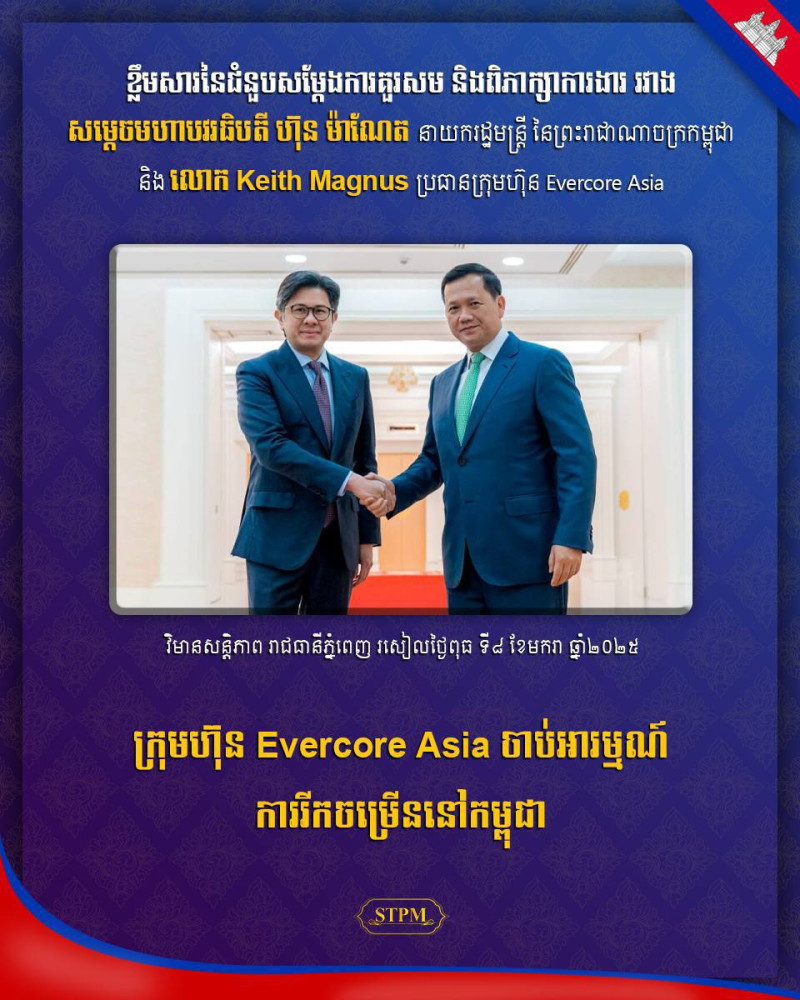 AKP ភ្នំពេញ ថ្ងៃទី០៨ ខែមករា ឆ្នាំ២០២៥ – សម្ដេចមហាបវរធិបតី ហ៊ុន ម៉ាណែត នាយករដ្ឋមន្ត្រីនៃព្រះរាជាណាចក្រកម្ពុជា នារសៀលថ្ងៃទី០៨ ខែមករា ឆ្នាំ២០២៥នេះ បានអនុញ្ញាតឱ្យលោក Keith Magnus ប្រធានក្រុមហ៊ុន Evercore Asia ចូលជួបសម្ដែងការគួរសម និងពិភាក្សាការងារ នៅវិមានសន្ដិភាព។
