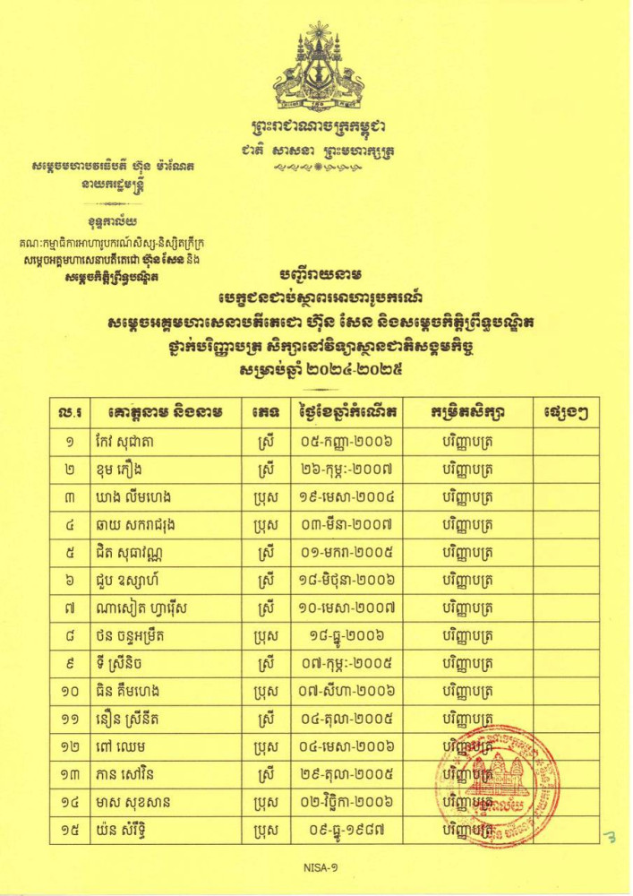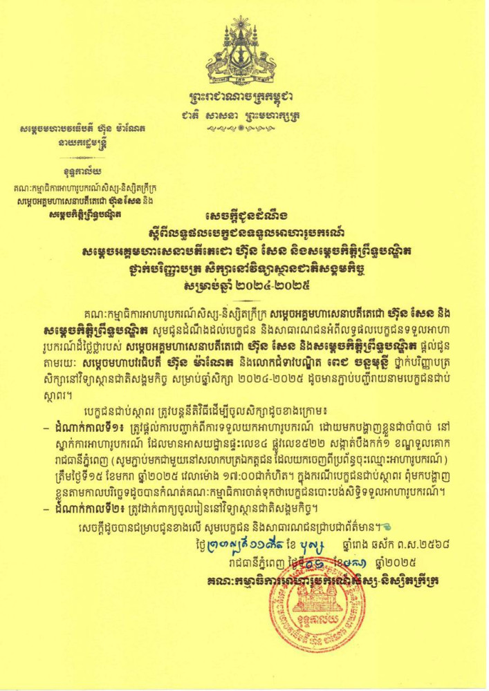 – ដំណាក់កាលទី១៖ ត្រូវផ្តល់ការបញ្ជាក់ពីការទទួលយកអាហារូបករណ៍ ដោយមកបង្ហាញខ្លួនជាចាំបាច់ នៅស្នាក់ការអាហារូបករណ៍ ដែលមានអាសយដ្ឋានផ្ទះលេខ៤ ផ្លូវលេខ៥២២ សង្កាត់បឹងកក់១ ខណ្ឌទួលគោក រាជធានីភ្នំពេញ (សូមភ្ជាប់មកជាមួយនៅសលាកបត្រឯកត្តជន ដែលយកចេញពីប្រព័ន្ធចុះឈ្មោះអាហារូបករណ៍) ត្រឹមថ្ងៃទី១៥ ខែមករា ឆ្នាំ២០២៥ វេលាម៉ោង ១៧:០០ជាកំហិត។ ក្នុងករណីបេក្ខជនជាប់ស្ថាពរ ពុំមកបង្ហាញខ្លួនតាមកាលបរិច្ឆេទដូចបានកំណត់គណៈកម្មាធិការចាត់ទុកថាបេក្ខជនបោះបង់សិទ្ធិទទួលអាហារូបករណ៍។