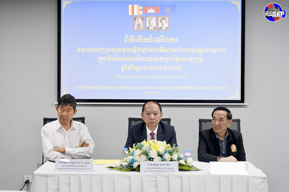ឯកឧត្តម សុក ផេង រដ្ឋលេខាធិការទីស្តីការគណៈរដ្ឋមន្ត្រី និងជាប្រធានគណៈកម្មាធិការប្រឡងថ្នាក់ជាតិសម្រាប់ការបណ្តុះបណ្តាលក្នុងវិស័យសុខាភិបាល អញ្ជើញជាអធិបតី ពិធីបើកដំណើរការទទួលពាក្យប្រឡងចូលរៀនថ្នាក់ជាតិ សម្រាប់ការបណ្តុះបណ្តាលក្នុងវិស័យសុខាភិបាលតាមប្រព័ន្ធអនឡាញ នាព្រឹកថ្ងៃទី១៥ ខែមករា ឆ្នាំ២០២៥ នៅសង្កាត់ជ្រោយចង្វារ រាជធានីភ្នំពេញ។
