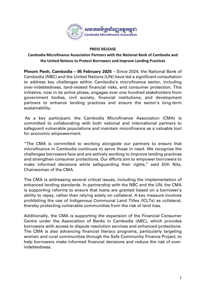 AKP ភ្នំពេញ ថ្ងៃទី០៥ ខែកុម្ភៈ ឆ្នាំ២០២៥–ចាប់តាំងពីឆ្នាំ២០២៤ ធនាគារជាតិនៃកម្ពុជា (NBC) និងអង្គការសហប្រជាជាតិ (UN) បានដឹកនាំការពិគ្រោះយោបល់ដ៏សំខាន់មួយ ដើម្បីដោះស្រាយបញ្ហាប្រឈមសំខាន់ៗក្នុងវិស័យមីក្រូហិរញ្ញវត្ថុនៅកម្ពុជា ដូចជាបញ្ហាបំណុលច្រើនលើសលុប ហានិភ័យហិរញ្ញវត្ថុពាក់ព័ន្ធនឹងដីធ្លី និងកិច្ចការពារអតិថិជន។ បច្ចុប្បន្នគំនិតផ្តួចផ្តើមនេះ គឺស្ថិតក្នុងដំណាក់កាល ដែលកំពុង អនុវត្តយ៉ាងសកម្ម ដោយមានការចូលរួមពីភាគីពាក់ព័ន្ធជាង ១០០ ស្ថាប័ន មកពីផ្នែករាជរដ្ឋាភិបាល អង្គការសង្គមស៊ីវិល គ្រឹះស្ថានហិរញ្ញវត្ថុ និងដៃគូអភិវឌ្ឍន៍ ដើម្បីពង្រឹងប្រតិបត្តិការផ្តល់ប្រាក់កម្ចី និងធានា នូវនិរន្តរភាពយូរអង្វែងរបស់វិស័យ។