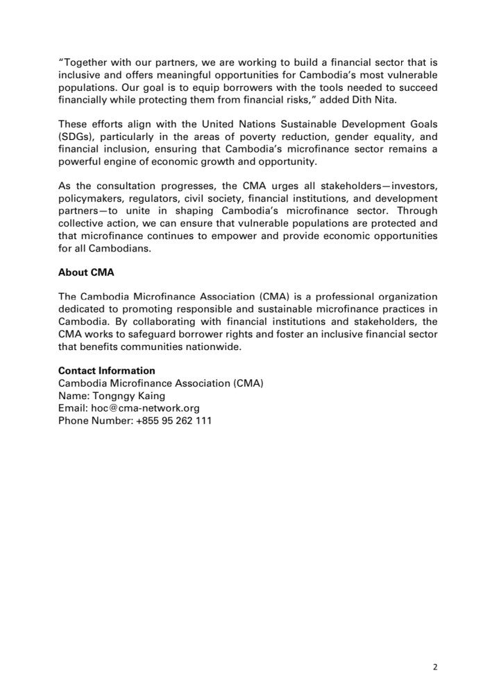 ក្នុងពេលដែលការពិគ្រោះយោបល់កំពុងដំណើរការ សមាគមមីក្រូហិរញ្ញវត្ថុកម្ពុជាសូមអំពាវនាវឱ្យភាគីពាក់ព័ន្ធទាំងអស់ ដូចជាវិនិយោគិន អ្នកបង្កើតគោលនយោបាយ និយ័តករ អង្គការសង្គមស៊ីវិល គ្រឹះស្ថានហិរញ្ញវត្ថុ និងដៃគូអភិវឌ្ឍន៍ ចូលរួមសហការក្នុងការតម្រង់ទិសវិស័យមីក្រូហិរញ្ញវត្ថុនៅ