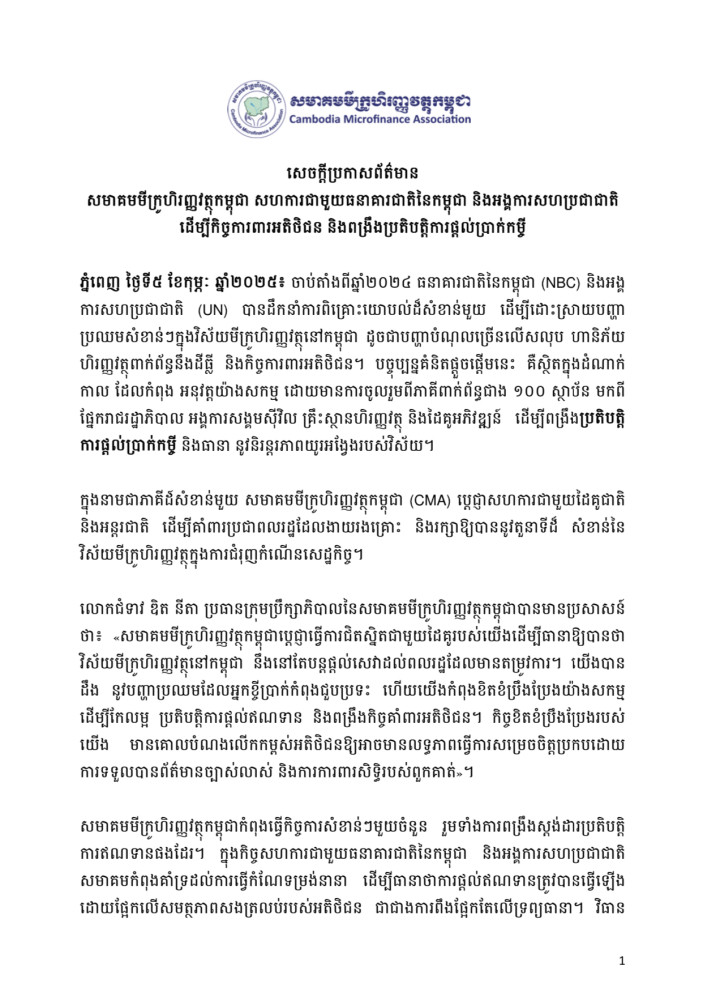 ចាប់តាំងពីឆ្នាំ២០២៤ ធនាគារជាតិនៃកម្ពុជា (NBC) និងអង្គការសហប្រជាជាតិ (UN) បានដឹកនាំការពិគ្រោះយោបល់ដ៏សំខាន់មួយ ដើម្បីដោះស្រាយបញ្ហាប្រឈមសំខាន់ៗក្នុងវិស័យមីក្រូហិរញ្ញវត្ថុនៅកម្ពុជា