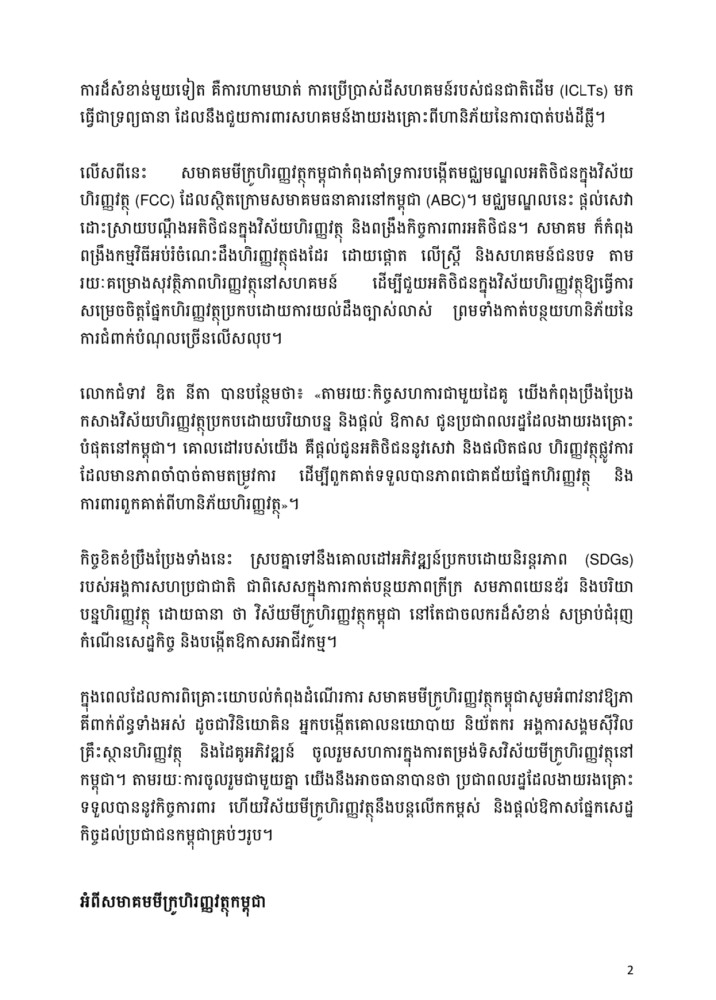 កម្ពុជា។ តាមរយៈការចូលរួមជាមួយគ្នា យើងនឹងអាចធានាបានថា ប្រជាពលរដ្ឋដែលងាយរងគ្រោះទទួលបាននូវកិច្ចការពារ ហើយវិស័យមីក្រូហិរញ្ញវត្ថុនឹងបន្តលើកកម្ពស់ និងផ្តល់ឱកាសផ្នែកសេដ្ឋកិច្ចដល់ប្រជាជនកម្ពុជាគ្រប់ៗរូប៕