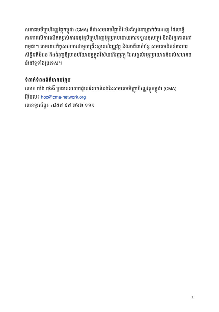 ក្នុងនាមជាភាគីដ៏សំខាន់មួយ សមាគមមីក្រូហិរញ្ញវត្ថុកម្ពុជា (CMA) ប្តេជ្ញាសហការជាមួយដៃគូជាតិនិងអន្តរជាតិ ដើម្បីគាំពារប្រជាពលរដ្ឋដែលងាយរងគ្រោះ និងរក្សាឱ្យបាននូវតួនាទីដ៏ សំខាន់នៃវិស័យមីក្រូហិរញ្ញវត្ថុក្នុងការជំរុញកំណើនសេដ្ឋកិច្ច។