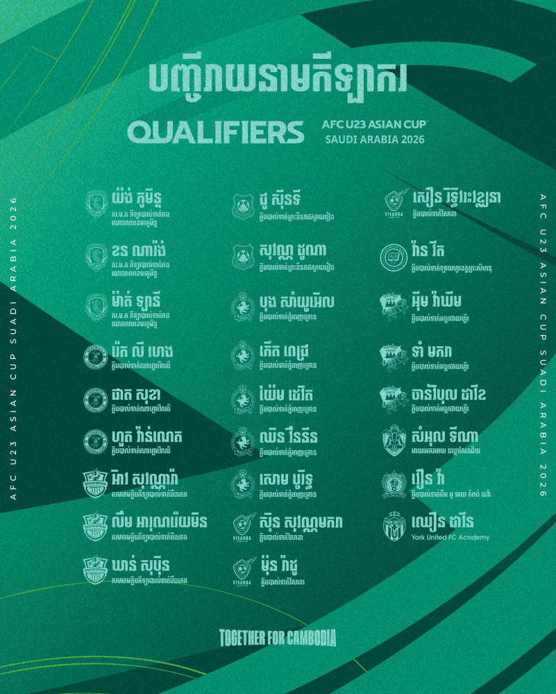AKP ភ្នំពេញ ថ្ងៃទី២៦ ខែសីហា ឆ្នាំ២០២៥--សហព័ន្ធកីឡាបាល់ទាត់កម្ពុជា (FFC) បានចេញបញ្ជីរាយនាមក្រុមជម្រើសជាតិកម្ពុជាអាយុក្រោម២៣ឆ្នាំ ចំនួន ២៦នាក់ចូលរួមប្រមូលផ្ដុំហ្វឹកហាត់ ត្រៀមការប្រកួតវគ្គជម្រុះពូល G នៃពានរង្វាន់ AFC U23 Asian Cup Saudi Arabia 2026 ចាប់ពីថ្ងៃទី០៣-០៩ ខែកញ្ញា ឆ្នាំ២០២៥ នៅពហុកីឡដ្ឋានជាតិអូឡាំពិក។