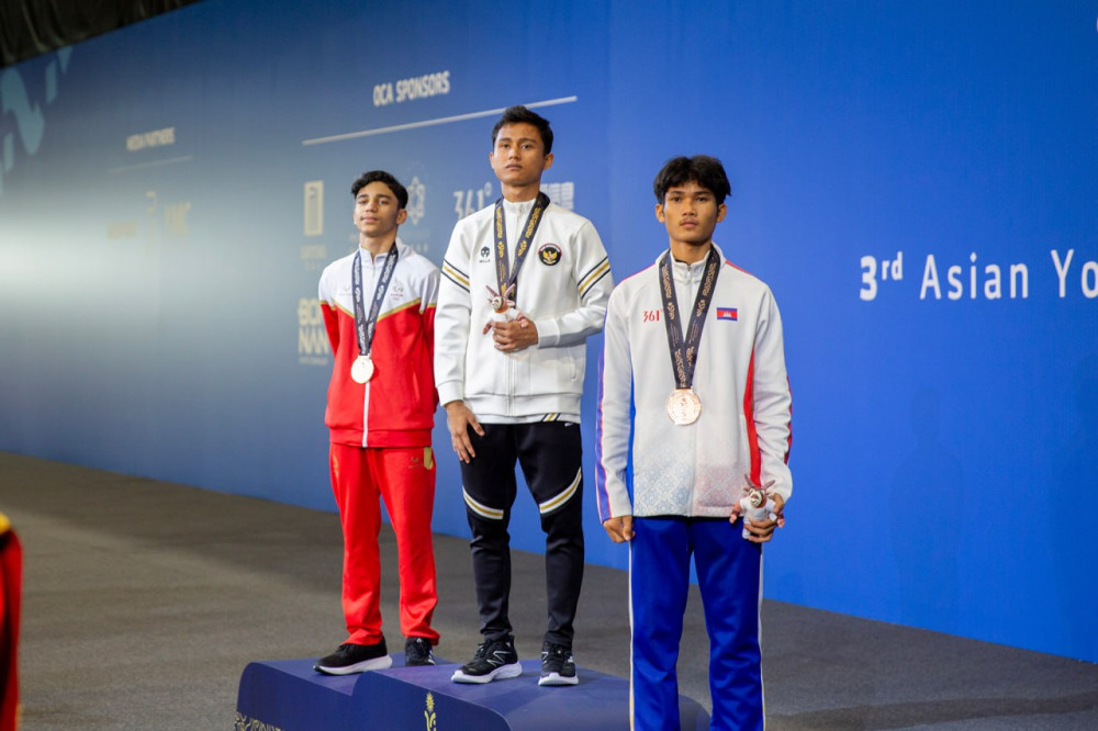 AKP ភ្នំពេញ ថ្ងៃទី២១ ខែតុលា ឆ្នាំ២០២៥--កីឡាករបញ្ចសីឡាត់កម្ពុជា ភុក ដានីញែល ដណ្តើមបានមេដាយសំរឹទ្ធ១គ្រឿង បន្ទាប់ពីបានប្រកួតចាញ់កីឡាករជម្រើសជាតិឥណ្ឌូណេស៊ី Habbil Furgon Winata ក្នុងវគ្គពាក់កណ្ដាលផ្ដាច់ព្រ័ត្រលើវិញ្ញាសាប្រយុទ្ធបុរស Class D over 51kg-55 kg ក្នុងព្រឹត្តិការណ៍កីឡាយុវជនអាស៊ី លើកទី៣ ឆ្នាំ២០២៥ នៅប្រទេសបារ៉ែន។