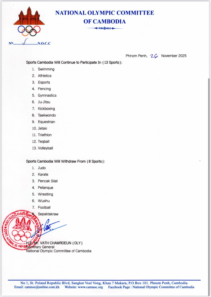 នៅក្នុងលិខិតផ្លូវការមួយ ថ្ងៃទី២៦ ខែវិច្ឆិកា ឆ្នាំ២០២៥ ផ្ញើជូន Dato' Seri Chaiyapak Siriwat នាយកប្រតិបត្តិ សហព័ន្ធកីឡាអាស៊ីអាគ្នេយ៍ (SEAGF) ឯកឧត្តម វ៉ាត់ ចំរើន អគ្គលេខាធិការ NOCC បានបញ្ជាក់ពីការជូនដំណឹងអំពីការដកខ្លួនចេញប្រភេទកីឡាចំនួន៨របស់កម្ពុជា ក្នុងការប្រកួតកីឡាស៊ីហ្គេម លើកទី៣៣ នៅប្រទេសថៃ ពីថ្ងៃទី០៩-២០ ខែវិច្ឆិកា ឆ្នាំ២០២៥។ គណៈកម្មាធិការជាតិអូឡាំពិកកម្ពុជាសូមថ្លែងអំណរគុណយ៉ាងស្មោះស្ម័គ្រចំពោះសហព័ន្ធកីឡាអាស៊ីអាគ្នេយ៍ (SEAGF) ដែលបានបន្តដឹកនាំរបស់ខ្លួន និងគណៈកម្មាធិការរៀបចំស៊ីហ្គេមរបស់ប្រទេសថៃ (THASOC) ចំពោះការប្តេជ្ញាចិត្ត និងការខិតខំប្រឹងប្រែងយ៉ាងមុតមាំក្នុងការរៀបចំការប្រកួតកីឡាស៊ីហ្គេម។ NOCC ជូនដំណឹងជាផ្លូវការដល់ SEAGF ថា កម្ពុជានឹងចូលរួមប្រកួតតែលើ១៣ប្រភេទកីឡា ដោយសម្រេចដកខ្លួនចេញពីការប្រកួតចំនួន ៨ប្រភេទកីឡា។
