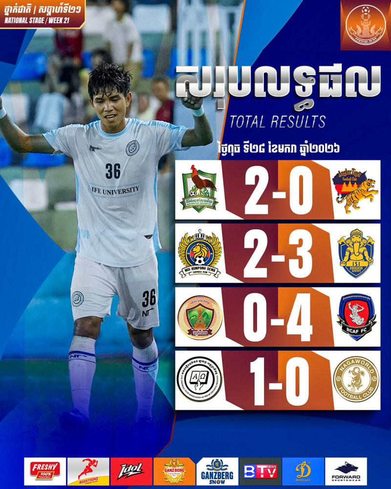 AKP ភ្នំពេញ ថ្ងៃទី២៩ ខែមករា ឆ្នាំ២០២៦--ការប្រកួតកីឡាបាល់ទាត់ ពានរង្វាន់សម្តេចតេជោ ហ៊ុន សែន វគ្គ១៦ក្រុមថ្នាក់ជាតិ បានរកឃើញលទ្ធផល ៤ប្រកួតបន្ថែម ដូចជាក្រុមគិរីវង់សុខសែនជ័យ ISIដង្កោសែនជ័យ ក្រុមទ័ព និងក្រុមឡាយហ្វខេត្តព្រះសីហនុ ដែលបានយកឈ្នះលើគូប្រជែងរៀងៗខ្លួន នៅជើងទី១ កាលពីល្ងាចថ្ងៃទី២៨ ខែមករា ឆ្នាំ២០២៦។