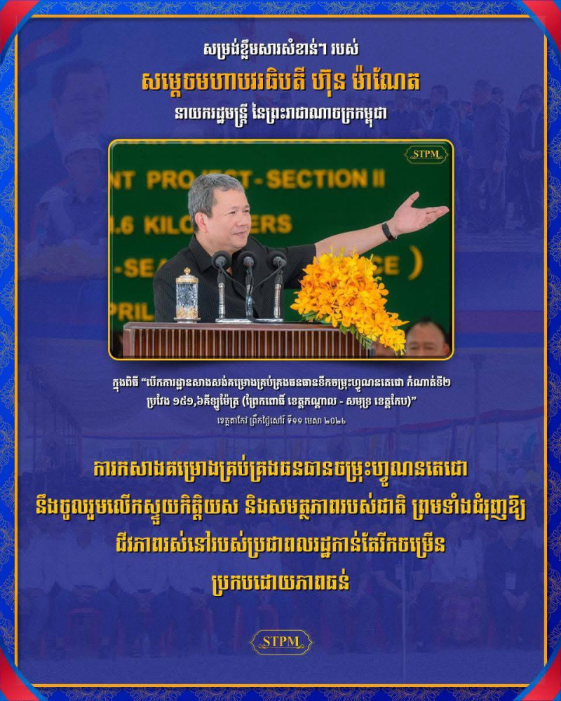 AKP ភ្នំពេញ ថ្ងៃទី១១ ខែមេសា ឆ្នាំ២០២៦–សម្តេចមហាបវរធិបតី ហ៊ុន ម៉ាណែត នាយករដ្ឋមន្ត្រីនៃព្រះរាជាណាចក្រកម្ពុជា បានថ្លែងក្នុងពិធីបើកការដ្ឋានសាងសង់ “គម្រោងគ្រប់គ្រងធនធានទឹកចម្រុះហ្វូណនតេជោ កំណាត់ទី ២” ប្រវែង ១៥១,៦ គីឡូម៉ែត្រ (ព្រែកពោធិ៍ ខេត្តកណ្តាល - សមុទ្រ ខេត្តកែប) នាព្រឹកថ្ងៃសៅរ៍ ទី១១ ខែមេសា ឆ្នាំ២០២៦ នៅខេត្តតាកែវថា ការកសាងគម្រោងគ្រប់គ្រងធនធានចម្រុះហ្វូណនតេជោ នឹងចូលរួមលើកស្ទួយកិត្តិយស និងសមត្ថភាពរបស់ជាតិ ព្រមទាំងជំរុញឱ្យជីវភាពរស់នៅរបស់ប្រជាពលរដ្ឋកាន់តែរីកចម្រើន ប្រកបដោយភាពធន់។ គម្រោងគ្រប់គ្រងធនធានទឹកចម្រុះហ្វូណនតេជោ កំណាត់ទី២ គឺជាការឆ្លុះបញ្ចាំងពីការប្តេជ្ញាចិត្តឥតងាករេរបស់រាជរដ្ឋាភិបាល ក្នុងការកសាងឱ្យបាននូវបណ្តាញផ្លូវនាវាចរណ៍ប្រវត្តិសាស្ត្រ ដែលនឹងតភ្ជាប់បណ្តាញនៃការដឹកជញ្ជូនរវាងផ្លូវទន្លេ និងផ្លូវសមុទ្រ ជាមួយឆន្ទៈ និងមនសិការ "ឧត្តមនិយម" ផលប្រយោជន៍ជាតិ និងប្រជាជន។