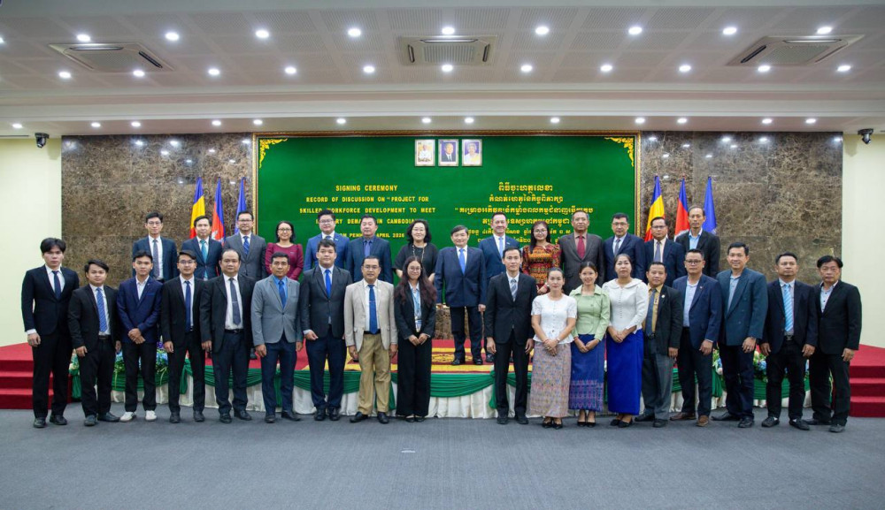 ឯកឧត្ដម ហេង សួរ រដ្ឋមន្ត្រីក្រសួងការងារ និងបណ្ដុះបណ្ដាលវិជ្ជាជីវៈ និងលោកស្រី ឆយ ម៉ូន ជុង (CHOI Moon Jung) នាយិកាទីភ្នាក់ងារសហប្រតិបត្តិការអន្តរជាតិកូរ៉េ (KOICA) ប្រចាំកម្ពុជា អញ្ជើញចុះហត្ថលេខាស្តីពី “គម្រោងអភិវឌ្ឍកម្លាំងពលកម្មជំនាញ ដើម្បីឆ្លើយតបតម្រូវការឧស្សាហកម្មនៅកម្ពុជា” នារសៀលថ្ងៃទី២០ ខែមេសា ឆ្នាំ២០២៦ នៅទីស្តីការក្រសួង រាជធានីភ្នំពេញ។