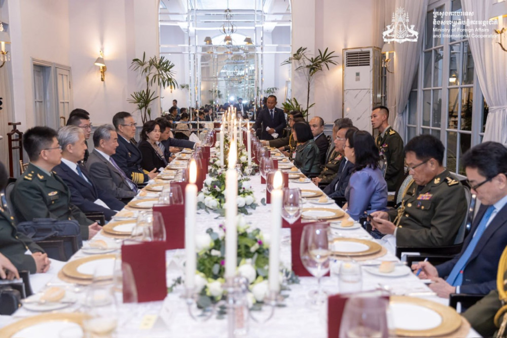 ឯកឧត្តមឧបនាយករដ្ឋមន្ត្រី ប្រាក់ សុខុន រដ្ឋមន្ត្រីការបរទេស និងសហប្រតិបត្តិការអន្តរជាតិ និងឯកឧត្តមឧបនាយករដ្ឋមន្ត្រី ទៀ សីហា រដ្ឋមន្ត្រីការពារជាតិ នៃព្រះរាជាណាចក្រកម្ពុជា រៀបចំអាហារពេលល្ងាចដើម្បីជាកិត្តិយសជូនឯកឧត្តម វ៉ាង យី (Wang Yi) រដ្ឋមន្ត្រីការបរទេស និងឯកឧត្តម តុង ជុន (Dong Jun) រដ្ឋមន្ត្រីការពារជាតិ នៃសាធារណរដ្ឋប្រជាមានិតចិន ក្នុងឱកាសអញ្ជើញចូលរួមកិច្ចប្រជុំលើកទី១ នៃកិច្ចសន្ទនាយុទ្ធសាស្ត្រ "២+២" រវាងរដ្ឋមន្ត្រីការបរទេស និងរដ្ឋមន្ត្រីការពារជាតិកម្ពុជា និងចិន នៅរាជធានីភ្នំពេញ នាថ្ងៃទី២២ ខែមេសា ឆ្នាំ២០២៦។