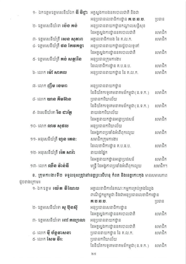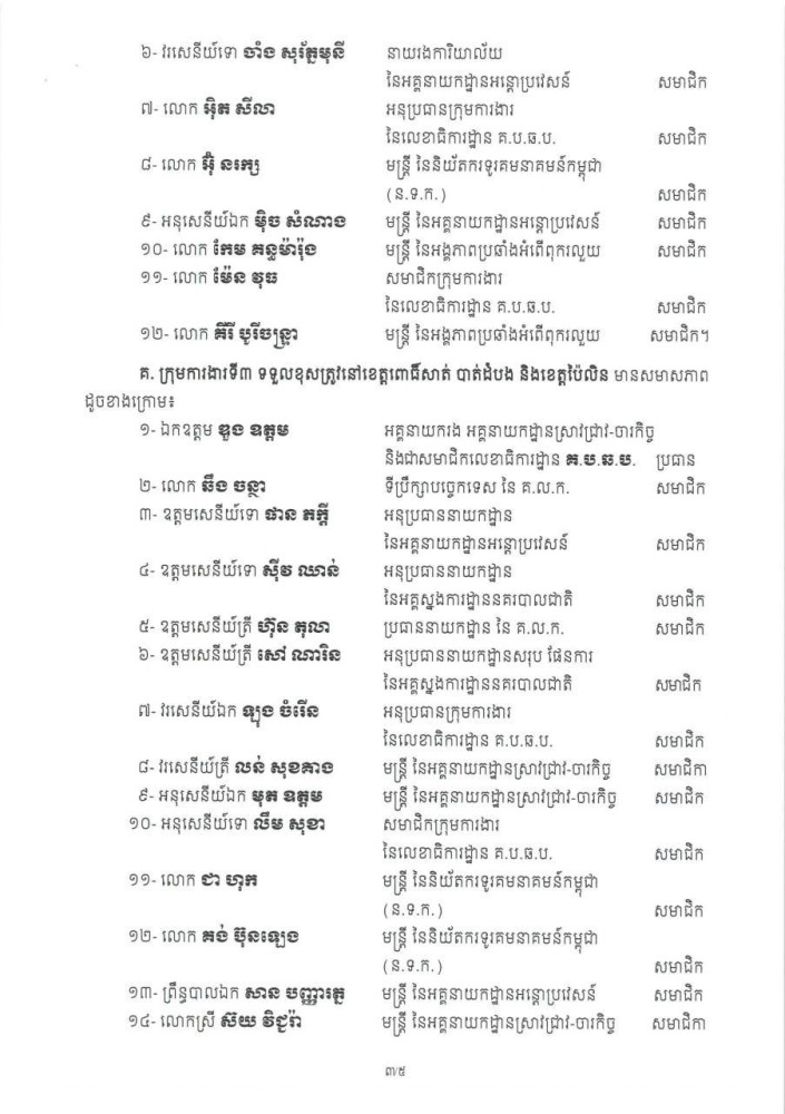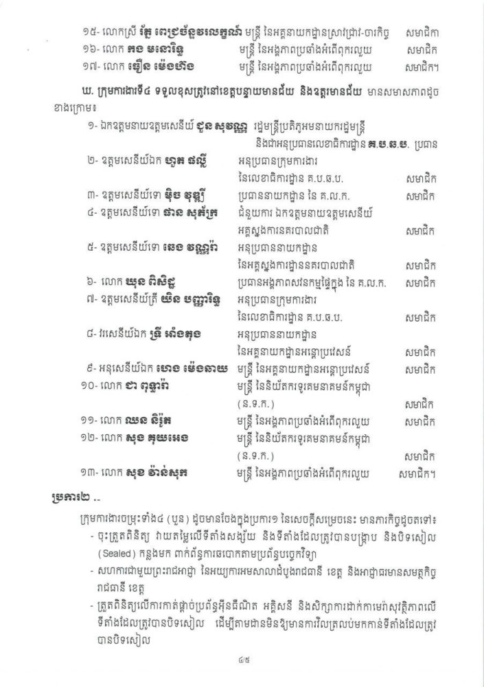 នេះបើតាមសេចក្តីសម្រេចស្តីពីការបង្កើតក្រុមការងារចម្រុះចំណុះលេខាធិការដ្ឋាននៃគណៈកម្មកាចំពោះកិច្ចប្រយុទ្ធប្រឆាំងការឆបោកតាមប្រព័ន្ធបច្ចេកវិទ្យា(ONLINE SCAMS)។