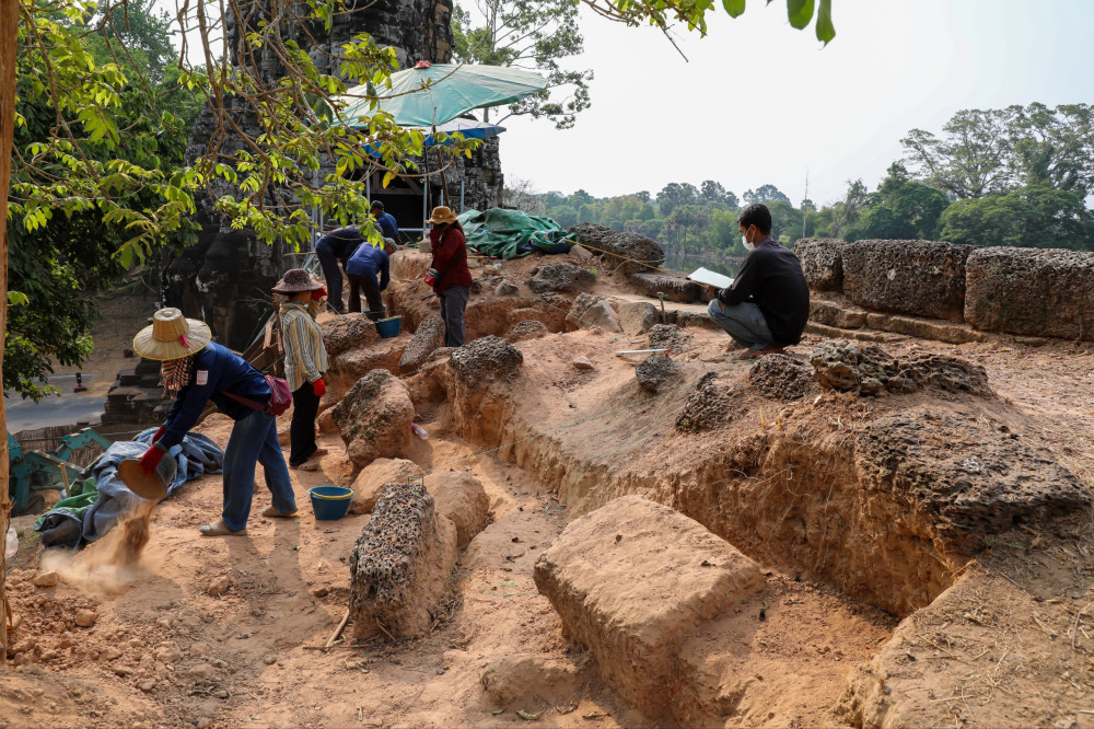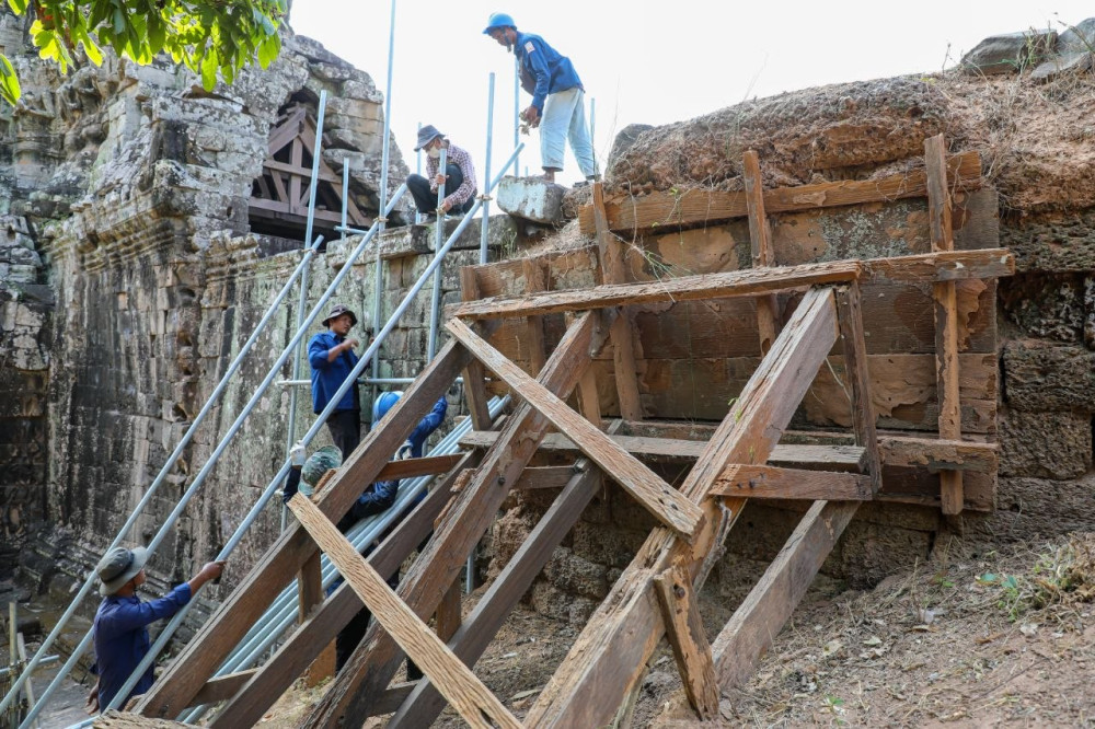 អាជ្ញាធរជាតិអប្សរា កំពុងជួសជុលជញ្ជាំងថ្មបាយក្រៀម ផ្នែកខាងត្បូង ឆៀងខាងលិចរបស់កំពែងក្រុងអង្គរធំ