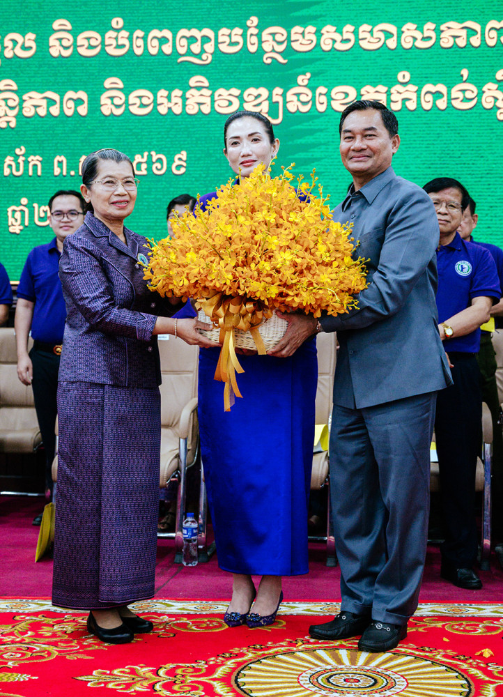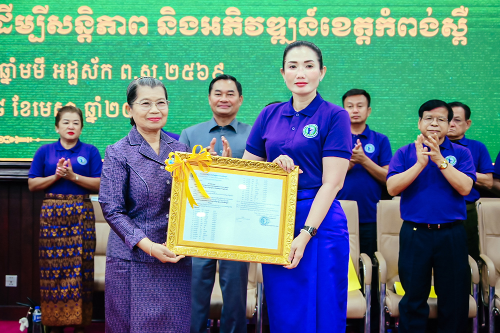 AKP កំពង់ស្ពឺ ថ្ងៃទី២៨ ខែមេសា ឆ្នាំ២០២៦ -- សម្តេចកិត្តិសង្គហបណ្ឌិត ម៉ែន សំអន ឧត្តមប្រឹក្សាផ្ទាល់ព្រះមហាក្សត្រ និងជាប្រធានសមាគមនារីកម្ពុជាដើម្បីសន្តិភាព និងអភិវឌ្ឍន៍ អញ្ជើញជាអធិបតីភាពដ៏ខ្ពង់ខ្ពស់ ក្នុងពិធីប្រកាសទទួលស្គាល់សមាសភាពរបស់គណៈកម្មការសាខាសមាគមនារីកម្ពុជាដើម្បីសន្តិភាព និងអភិវឌ្ឍន៍ខេត្តកំពង់ស្ពឺ។