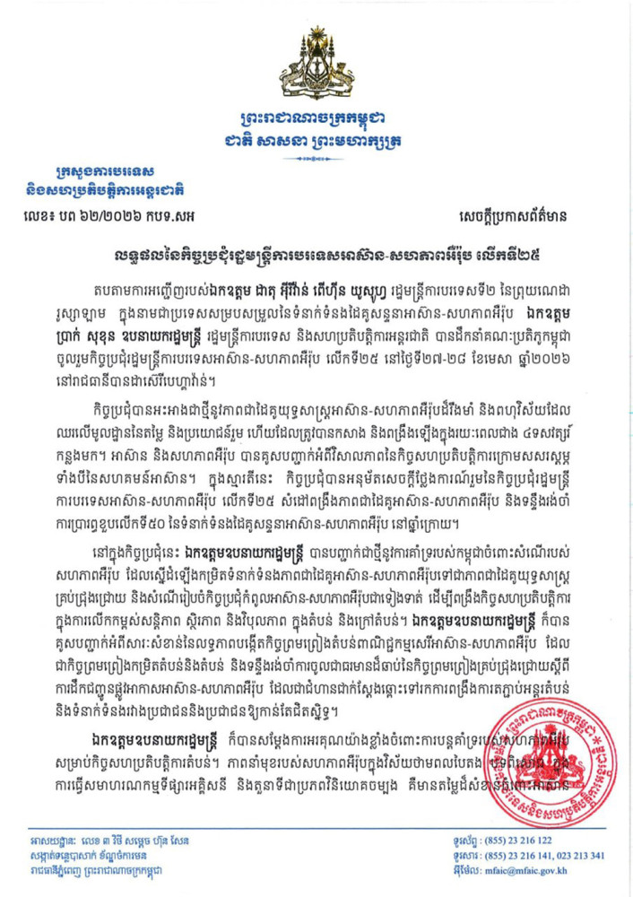 លទ្ធផលនៃកិច្ចប្រជុំរដ្ឋមន្ត្រីការបរទេសអាស៊ាន-សហភាពអឺរ៉ុប លើកទី២៥
