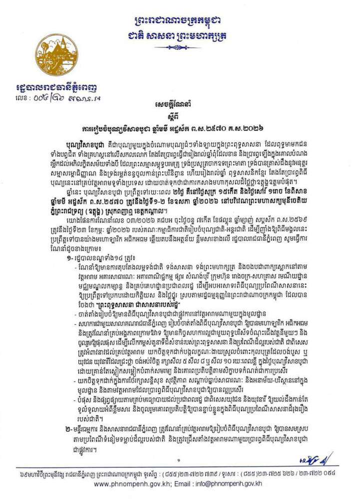 យោងតាមផែនការណែនាំលេខ ០៣/២០២៦ គជបអ ចុះថ្ងៃចន្ទ ៧កើត ខែផល្គុន ឆ្នាំម្សាញ់ សប្តស័ក ព.ស.២៥៦៩ ត្រូវនឹងថ្ងៃទី២៣ ខែកុម្ភៈ ឆ្នាំ២០២៦ របស់គណៈកម្មាធិការជាតិរៀបចំបុណ្យជាតិ-អន្តរជាតិ ដើម្បីញ៉ាំងឱ្យពិធីមង្គលនេះ ប្រព្រឹត្តទៅបានយ៉ាងមហោឡារិក អធិកអធម ឆ្លើយតបនឹងអត្ថន័យ ខ្លឹមសារខាងលើ រដ្ឋបាលរាជធានីភ្នំពេញ សូមធ្វើការ ណែនាំដូចខាងក្រោម៖