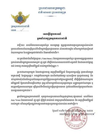 អ្នកនាំពាក្យក្រសួងការពារជាតិច្រានចោលទាំងស្រុងការចុះផ្សាយរបស់សារព័ត៌មានAsia Times ដែលផ្សាយលាបពណ៌ ញុះញង់ ធ្វើឱ្យប៉ះពាល់ដល់កិត្យានុភាពវិស័យយោធាកម្ពុជា