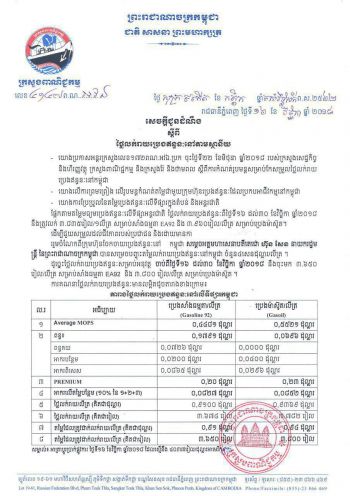 រាជរដ្ឋាភិបាលកំណត់តម្លៃលក់រាយប្រេងឥន្ធនៈ៣.៦៥០រៀលក្នុងមួយលីត សម្រាប់សាំងធម្មតា ចាប់ពីថ្ងៃទី១៦ ដល់ថ្ងៃទី៣០ ខែវិច្ឆិកា ឆ្នាំ២០១៨