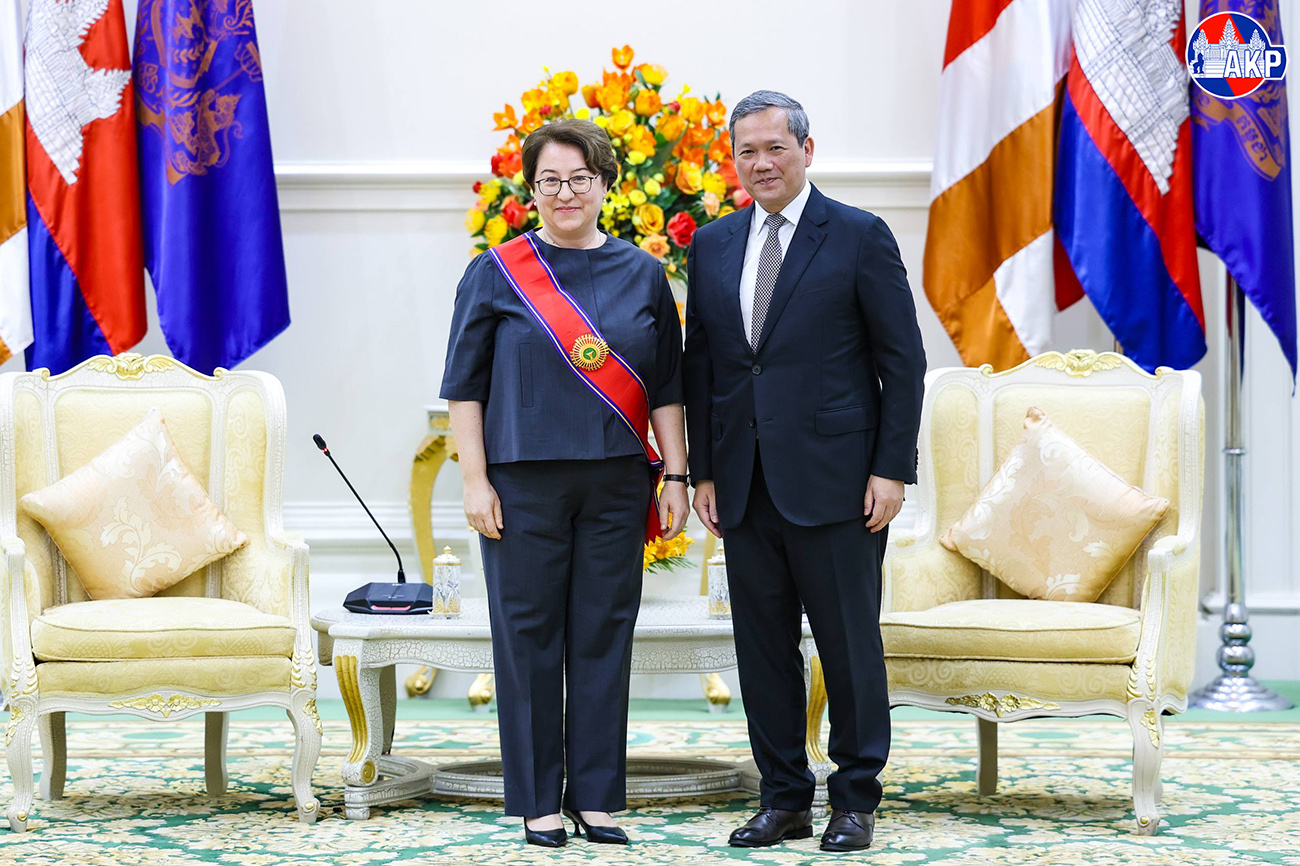 AKP Phnom Penh, April 10, 2026— Prime Minister Samdech Moha Borvor Thipadei Hun Manet (R, Pic. 1) poses for a photo with visiting H.E. Ms. Ülkü Kocaefe, outgoing Ambassador of the Republic of Türkiye to the Kingdom of Cambodia, prior to their farewell meeting at the Pe...