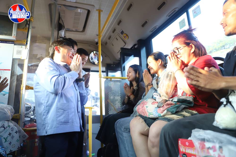 AKP Phnom Penh, April 12, 2026 — Minister of Labour and Vocational Training H.E. Heng Sour (L, Pic. 1) and Phnom Penh Municipal Governor H.E. Khuong Sreng (L, Pic. 2) see people off at a bus stop in Khan Russey Keo, Phnom Penh this morning. The fre...