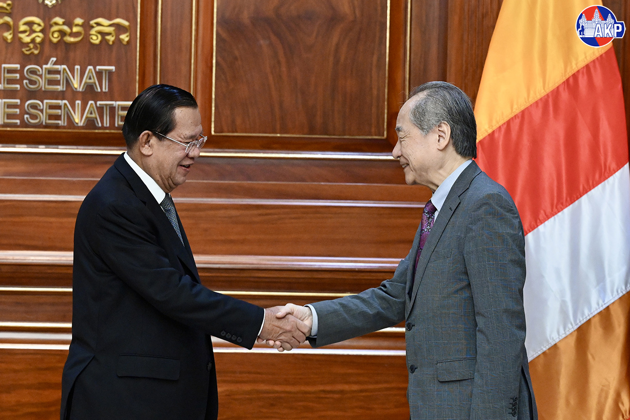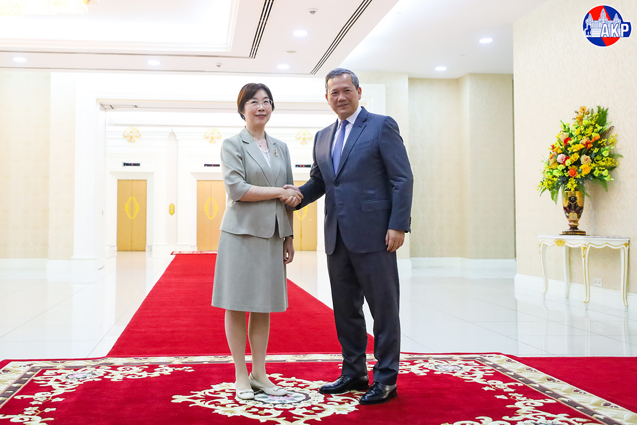 AKP Phnom Penh, April 10, 2026— Prime Minister Samdech Moha Borvor Thipadei Hun Manet (R, Pic. 1) poses for a photo with visiting H.E. Ms. Ülkü Kocaefe, outgoing Ambassador of the Republic of Türkiye to the Kingdom of Cambodia, prior to their farewell meeting at the Pe...