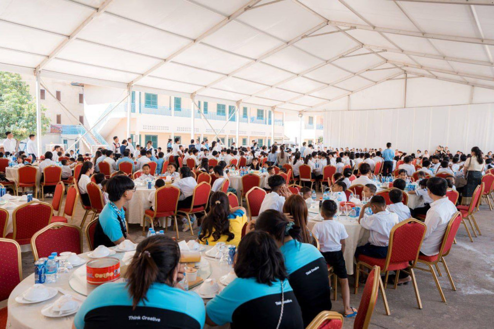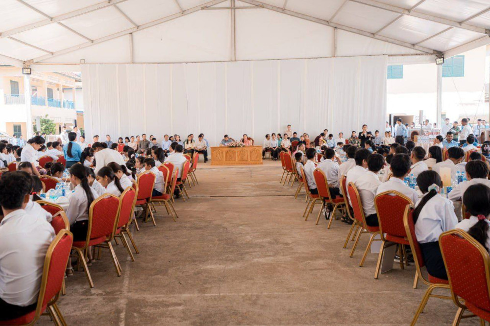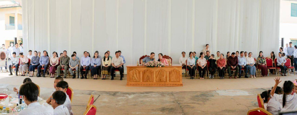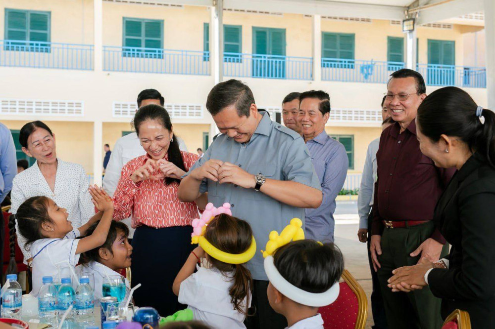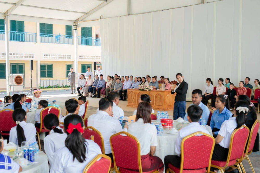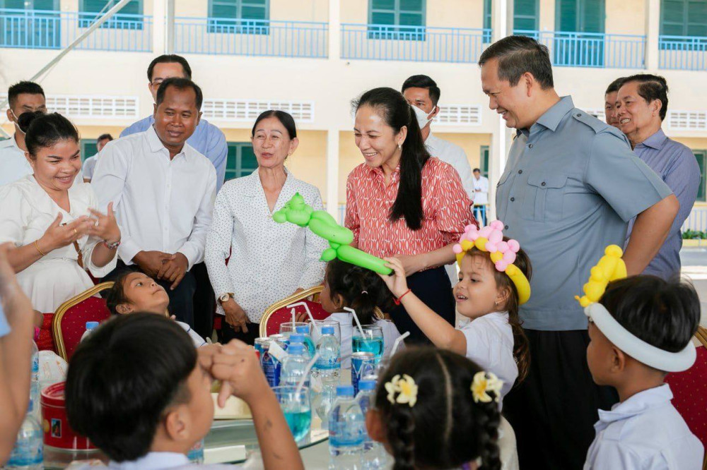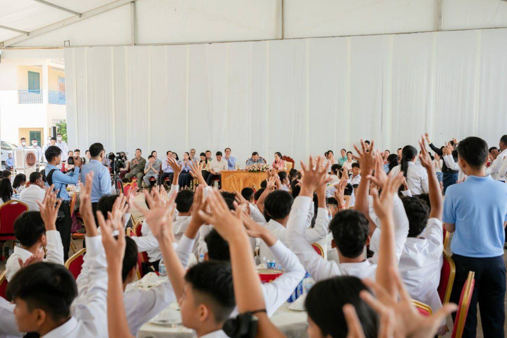 Prime Minister Samdech Moha Borvor Thipadei Hun Manet and First Lady, Lok Chumteav Dr. Pich Chanmony, hold a get-together with teachers and students of Phnom Penh Thmey Special Education High School in Phnom Penh this morning.
